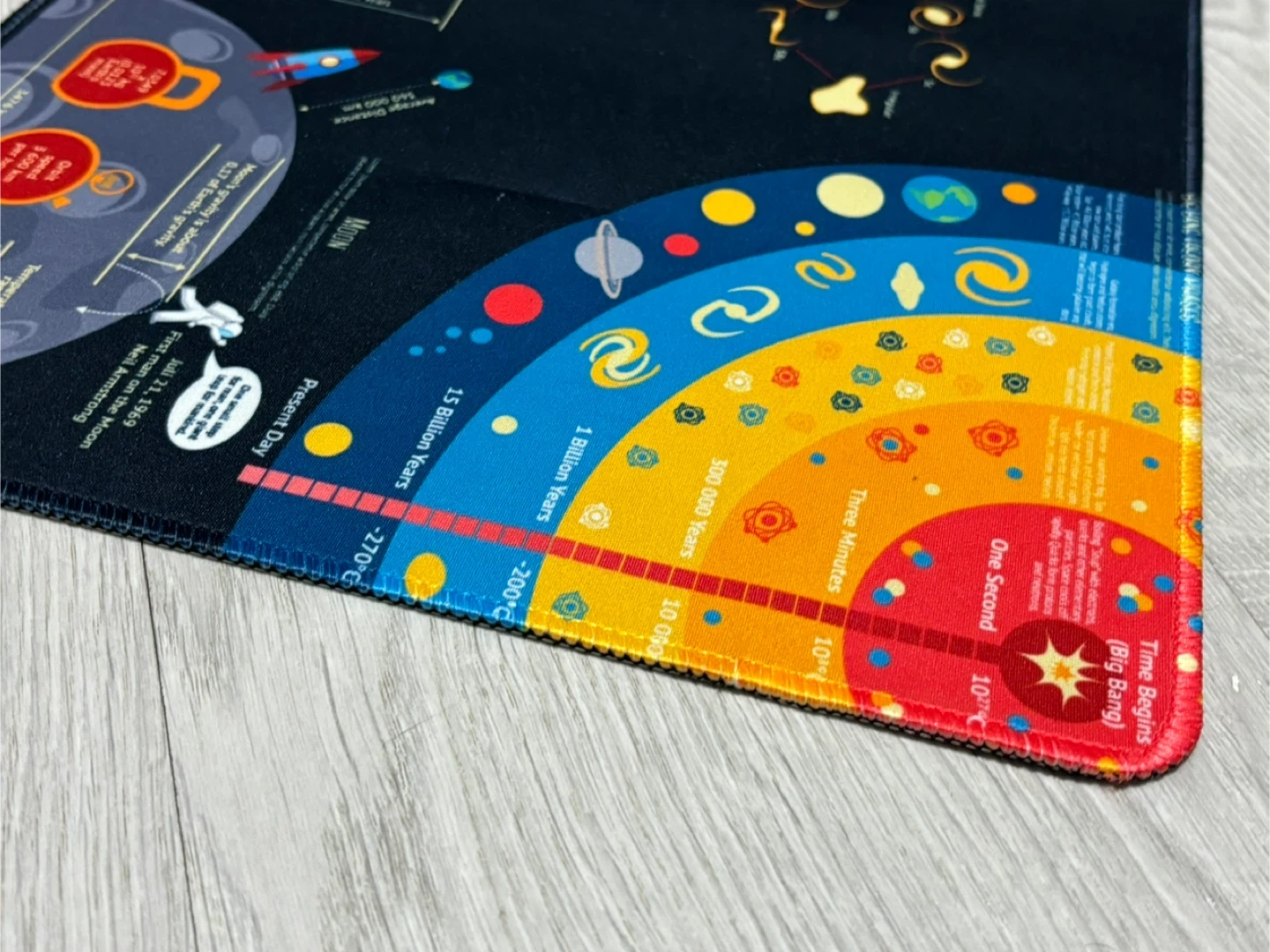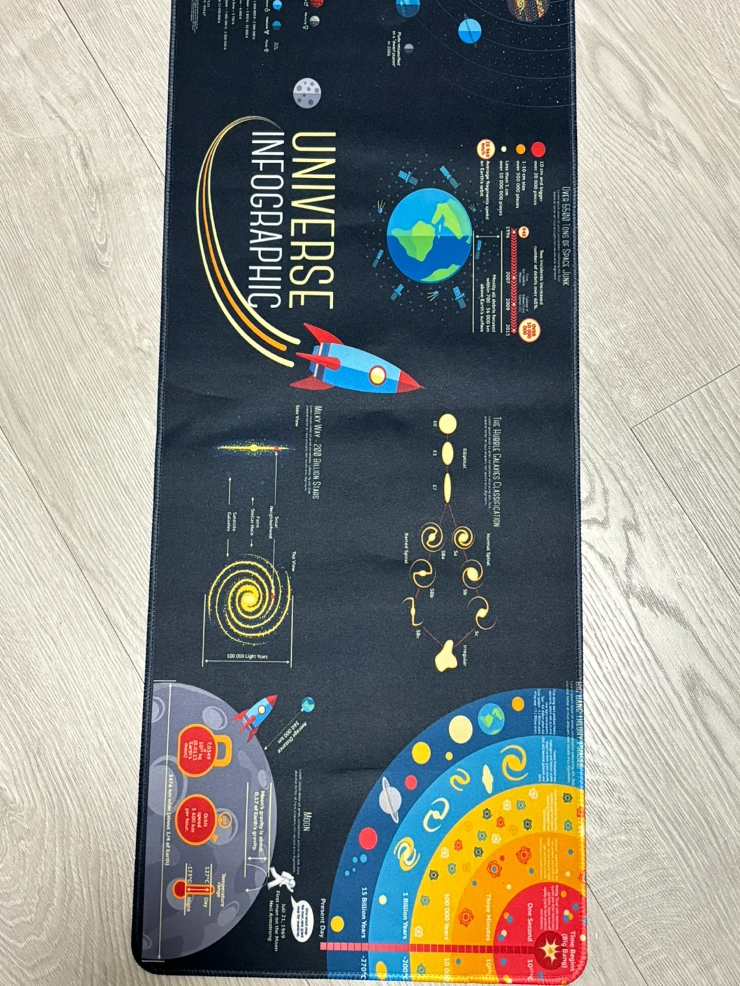 A fun playmat with a universe infographic design, perfect for kids who love space! It shows planets, galaxies, and the timeline of the universe. The material is soft and durable, great for playtime.