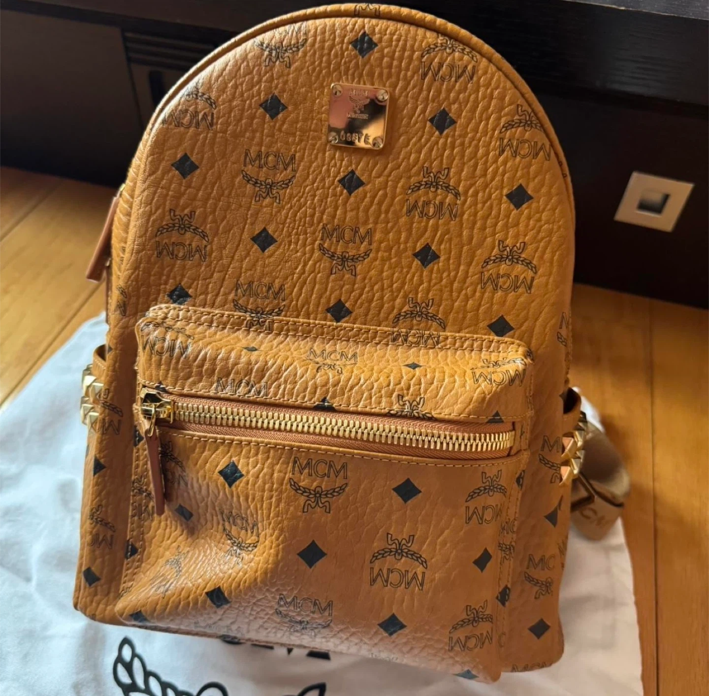 Stylish MCM backpack in their signature cognac Visetos print. It features a front zip pocket and adjustable shoulder straps. This bag is crafted from durable coated canvas with leather trim.