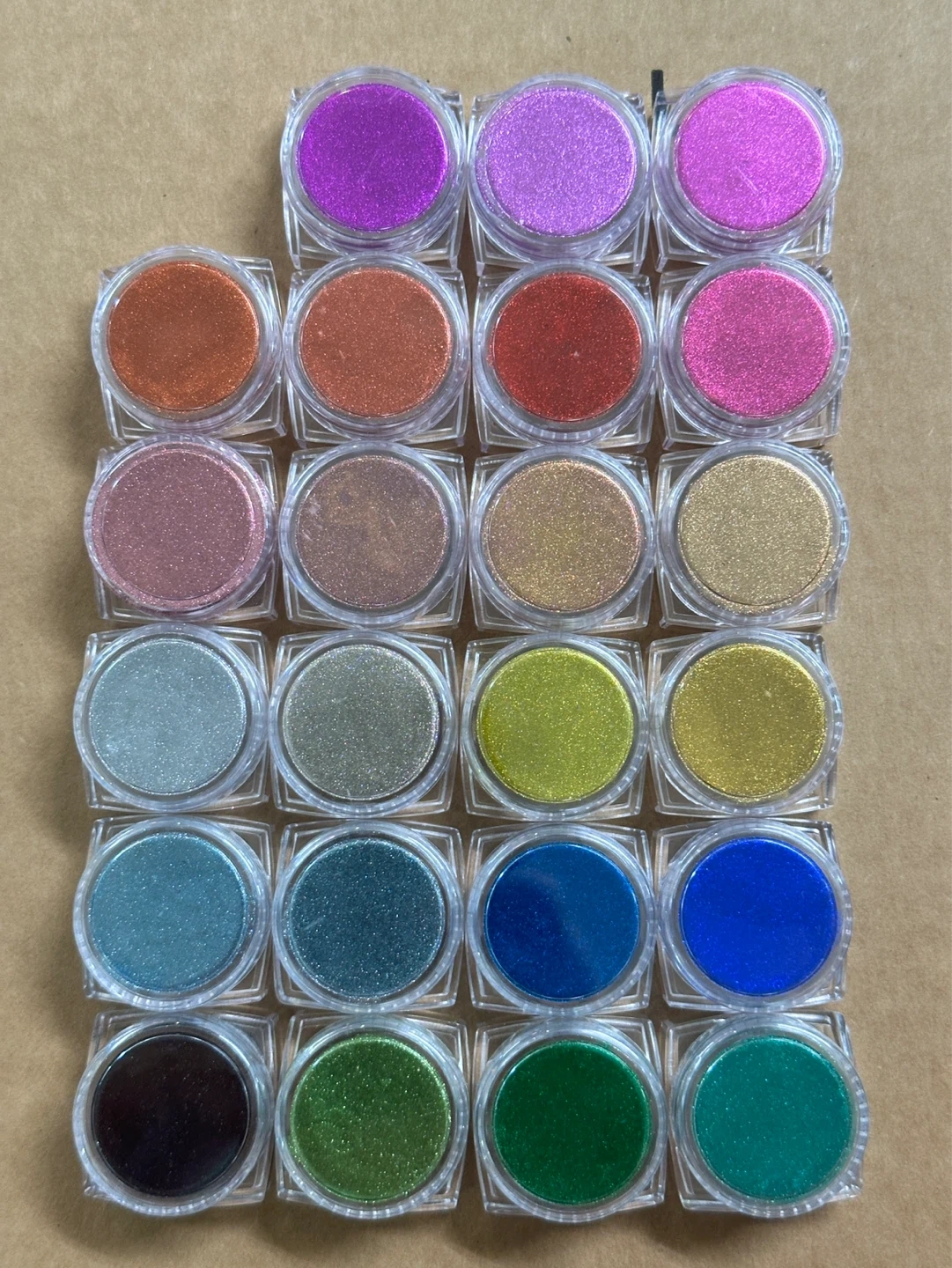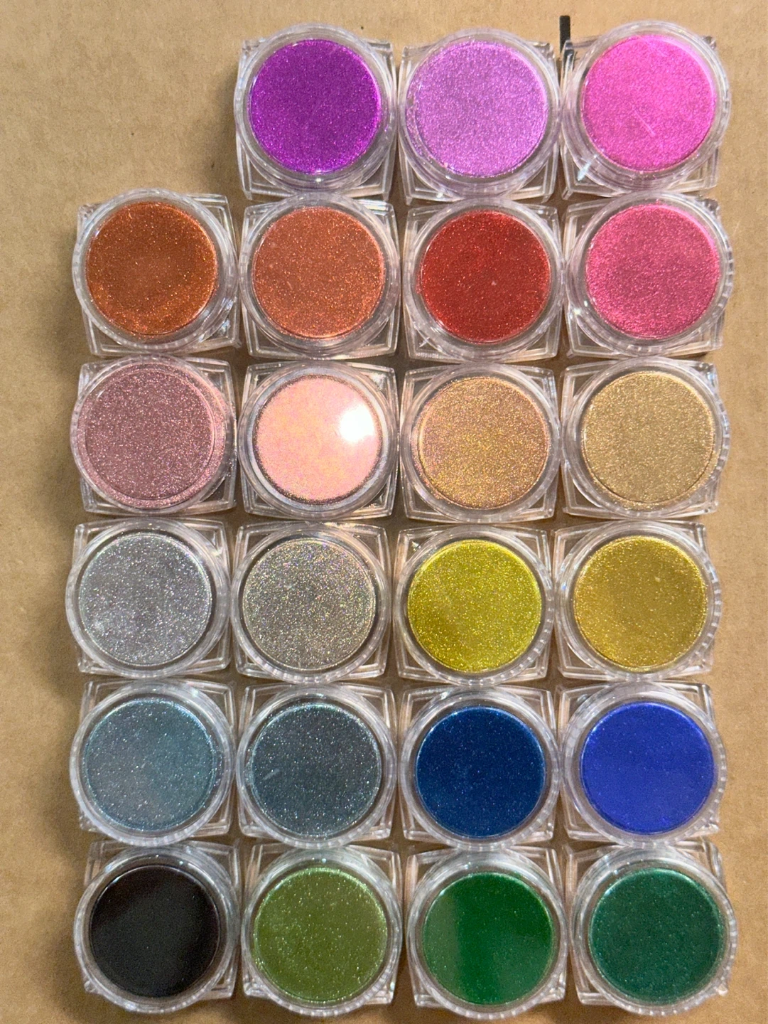 Set of 23 metallic chrome powders. These powders create a mirror like/reflective effect. They can be used in a variety of applications, including nail art, resin art, and makeup.