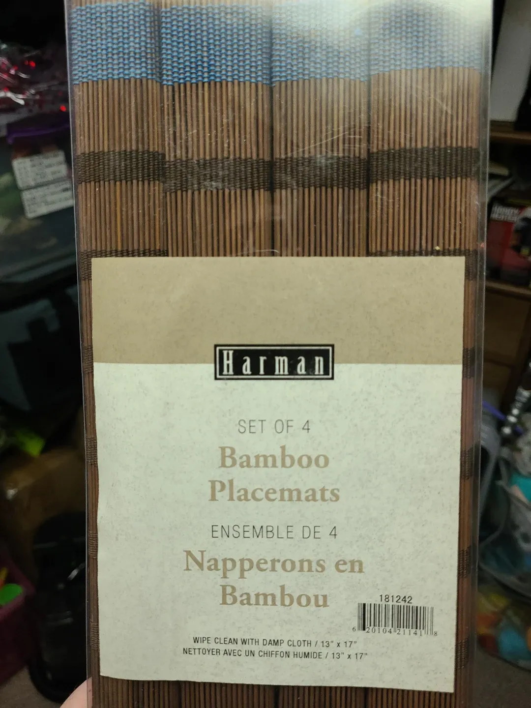 Set of 4 Harman bamboo placemats. Each measures 13" x 17". They're wipe clean with a damp cloth. 1 set of 4 for $15 or 2 sets for $25