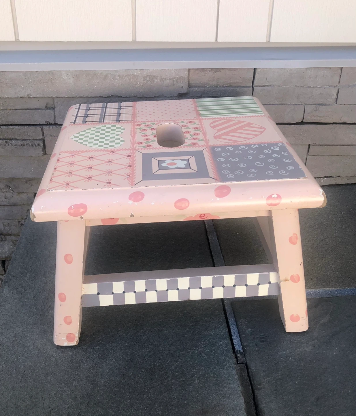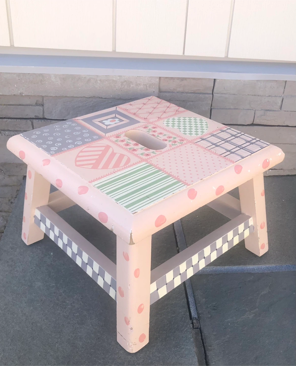 This is a cute, hand-painted wooden step stool. It features a patchwork design on top and polka dots on the legs. It has a pink and white color scheme. Perfect for a child's room or as a decorative piece