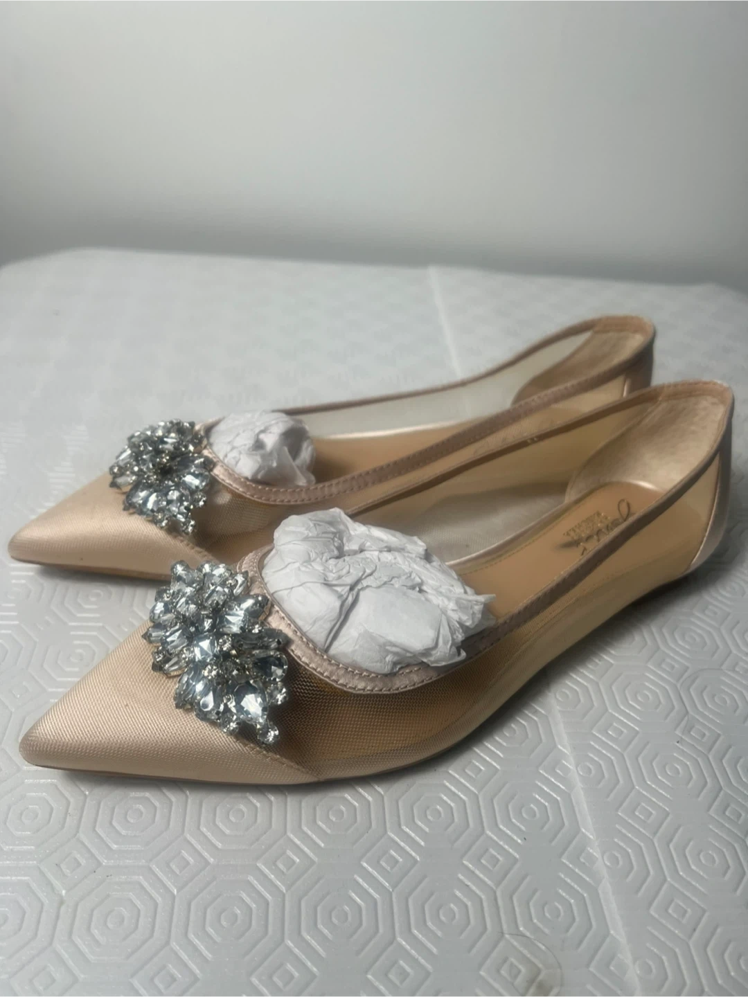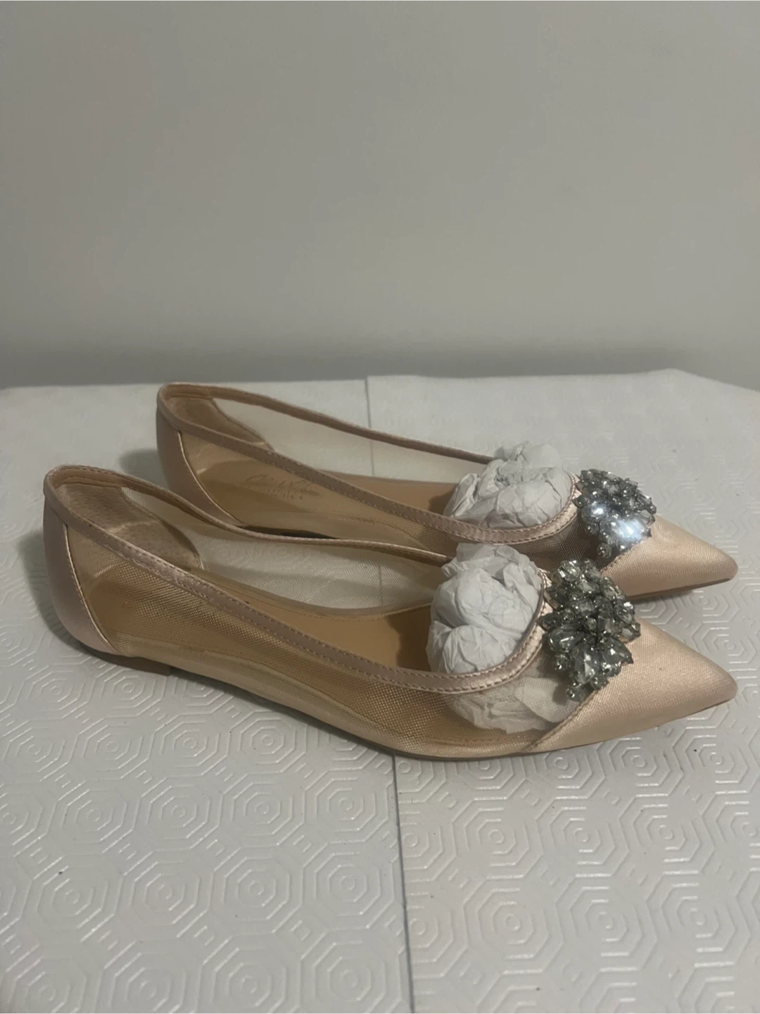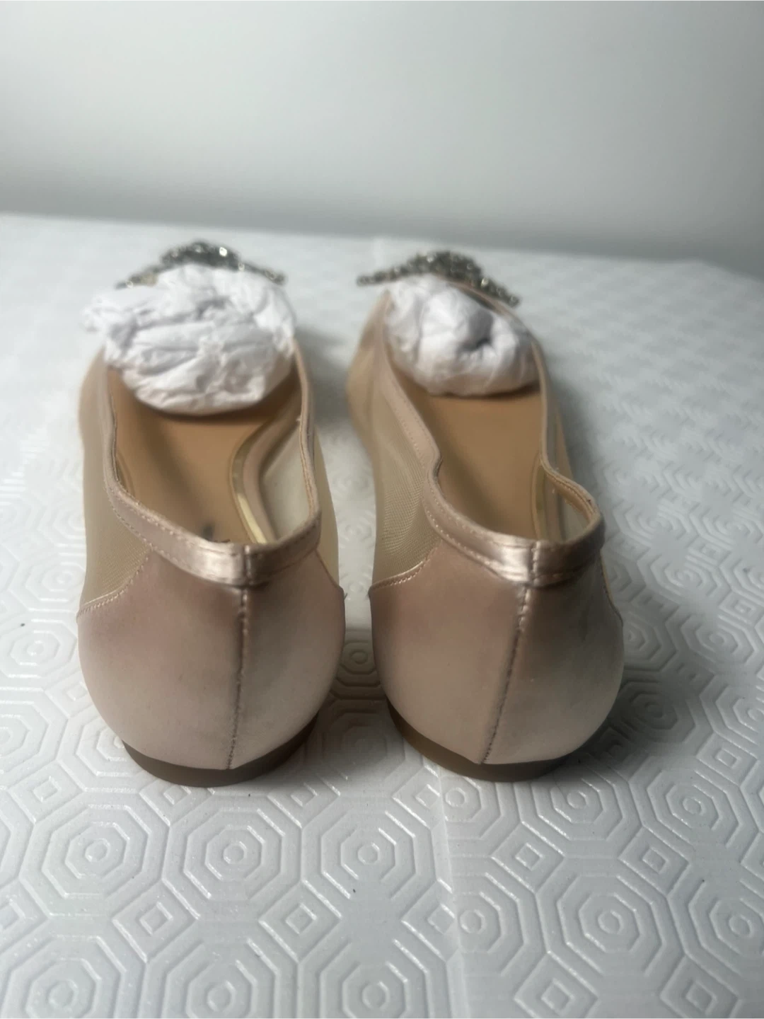 These pretty flats feature a rose gold satin and mesh upper with a dazzling crystal embellishment on the toe. They're a chic choice for special occasions or to add some sparkle to your everyday look! Satin and mesh upper. Crystal embellishments.