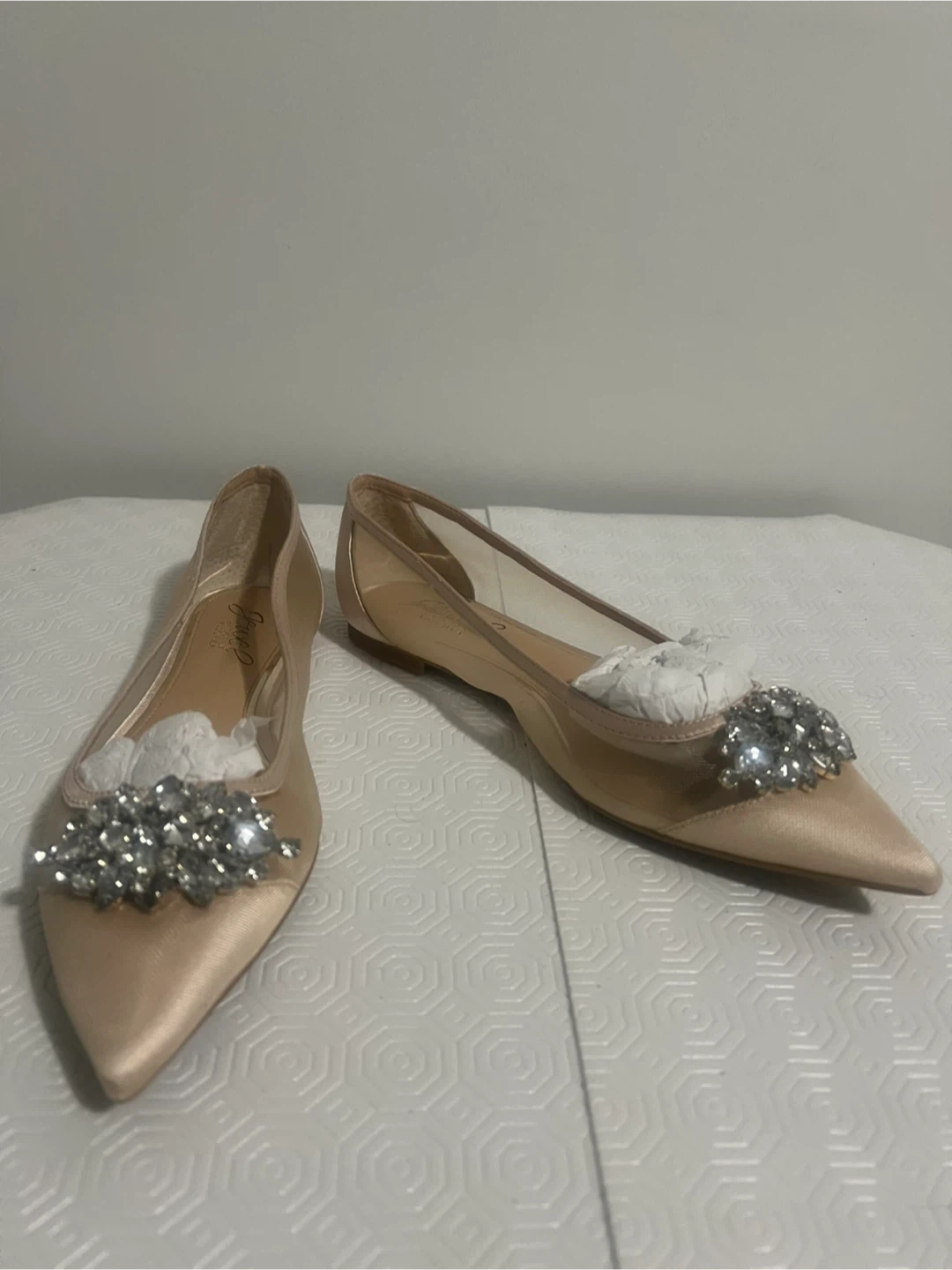 These pretty flats feature a rose gold satin and mesh upper with a dazzling crystal embellishment on the toe. They're a chic choice for special occasions or to add some sparkle to your everyday look! Satin and mesh upper. Crystal embellishments.