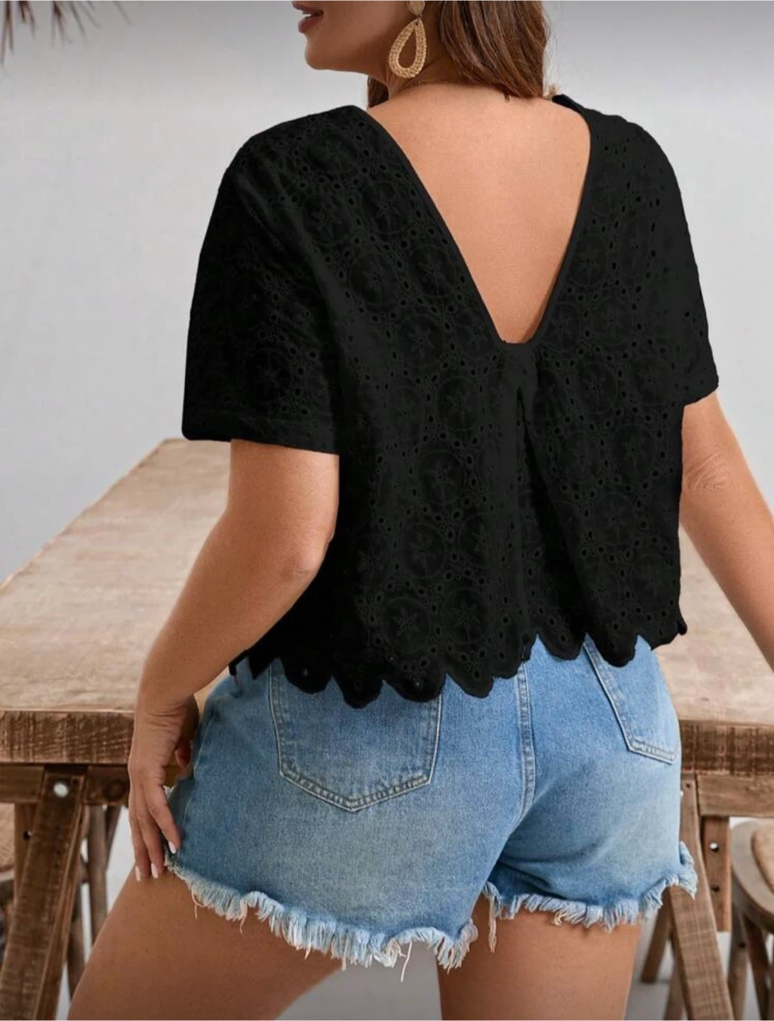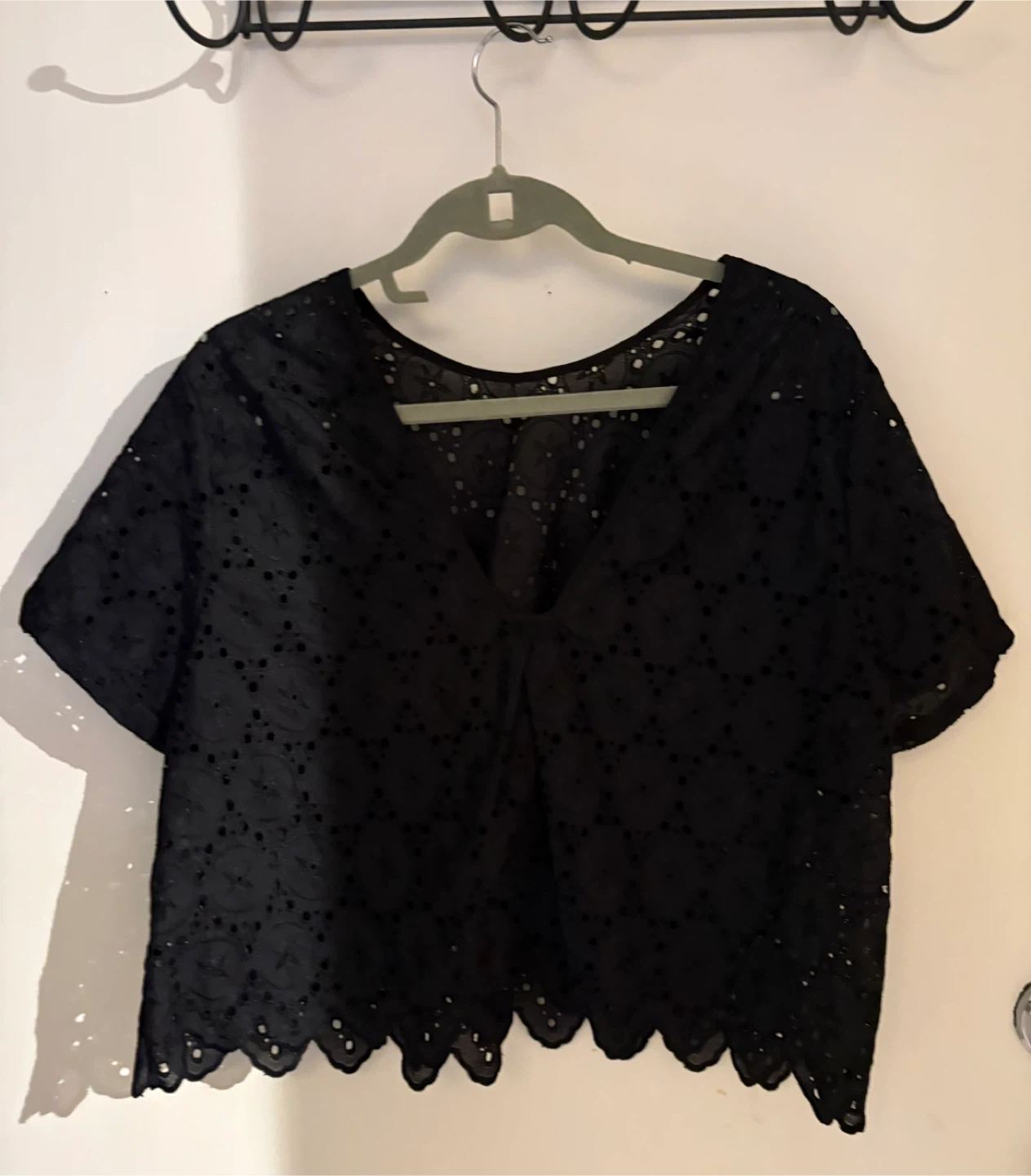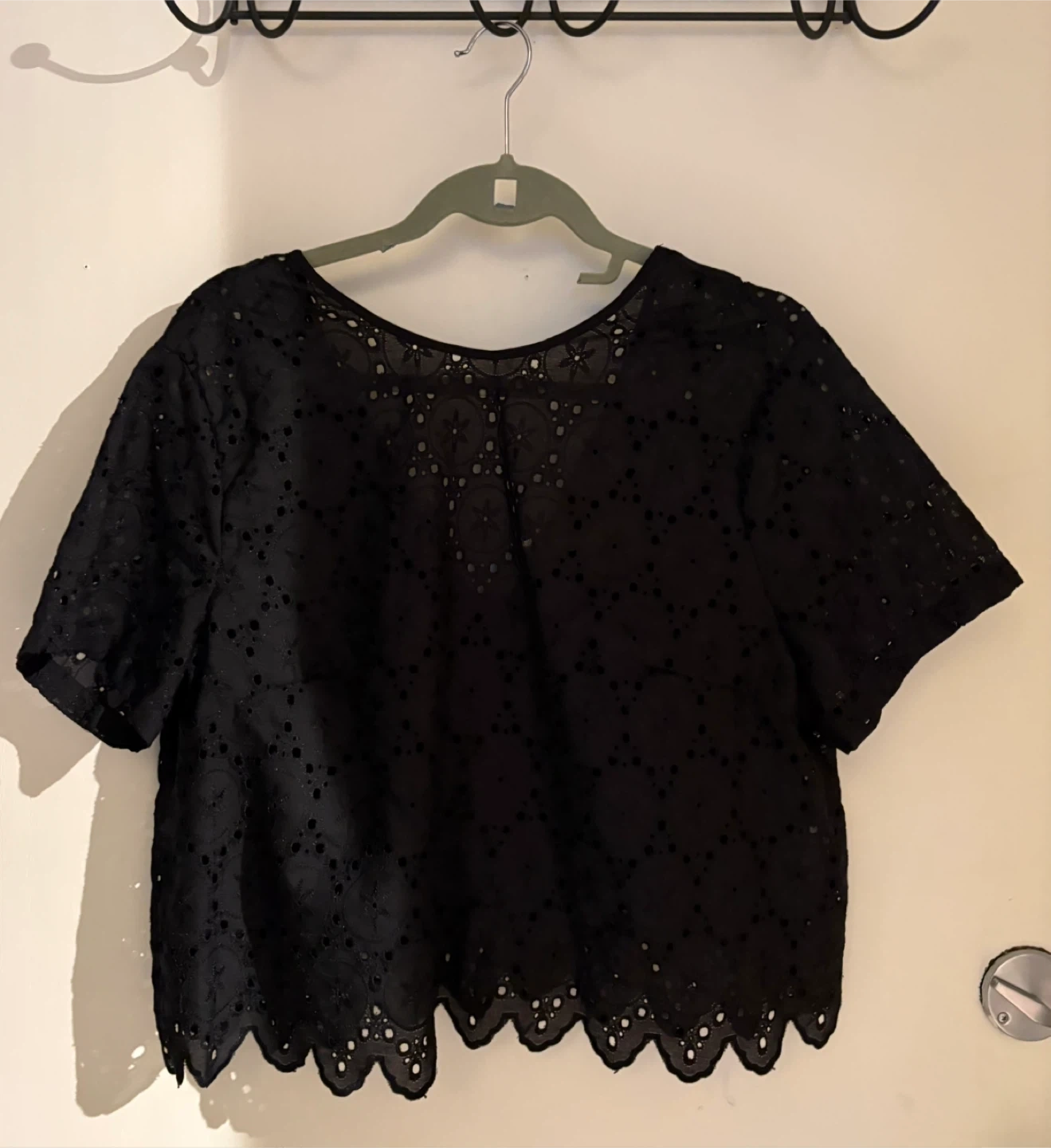 Buy & SellBlack Eyelet Crop TopBlack Eyelet Crop Top$10Black crop top with eyelet detailing and scalloped hem. Short sleeves and a V-back.ConditionGoodSize0XLWHERE TO MEETCheck LocationView MapSELLERverifiedAllieOliver620 reviews0 chats·0 favorites·11 viewsSEND CHAT TO SELLERHi Allie! I’m interested in your listing.Hi Allie! I’m interested in your listing.Get the Karrot app to chatSign In to chat