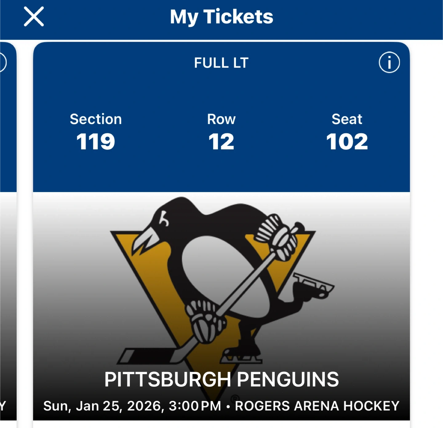 Two tickets for the Pittsburgh Penguins game on Sunday, Jan 25, 2026, at 3:00 PM at Rogers Arena. Seats are Section 119, Row 12, Seats 101 and 102. A great opportunity to see a hockey game!