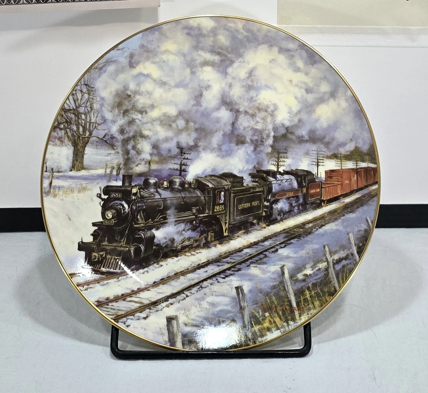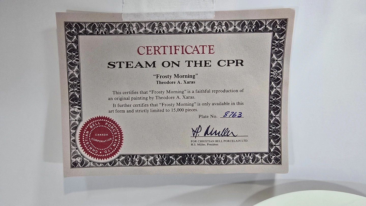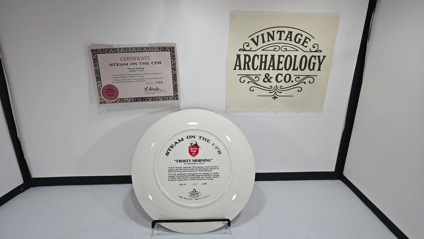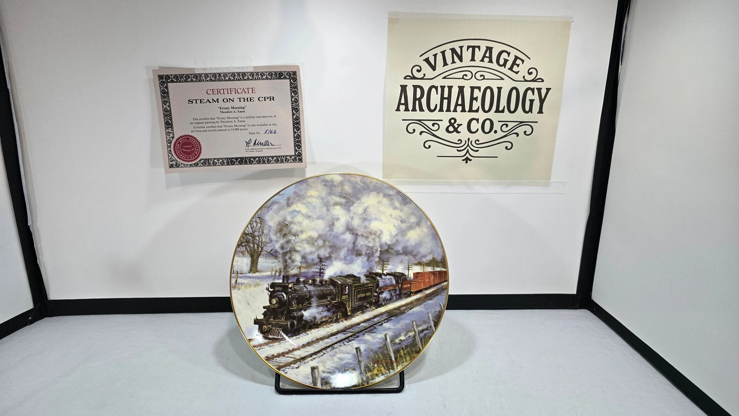 This collector plate was produced in the 1980s as part of a series celebrating Canadian Pacific Railway's steam locomotive heritage. The 'Steam on the CPR' series featured artwork by Ted Xaras depicting iconic winter railway scenes from Canada's golden age of steam travel.