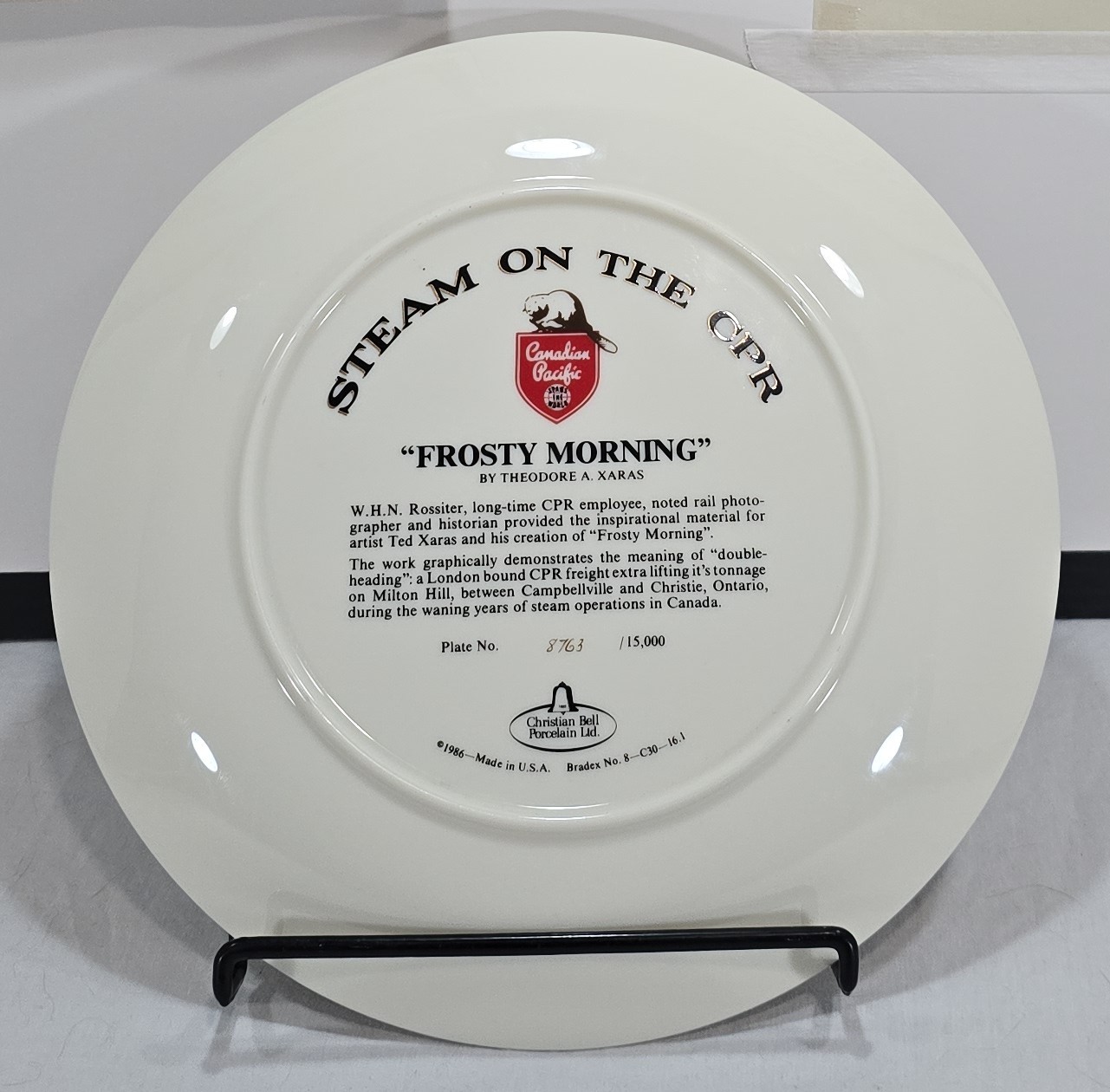 This collector plate was produced in the 1980s as part of a series celebrating Canadian Pacific Railway's steam locomotive heritage. The 'Steam on the CPR' series featured artwork by Ted Xaras depicting iconic winter railway scenes from Canada's golden age of steam travel.