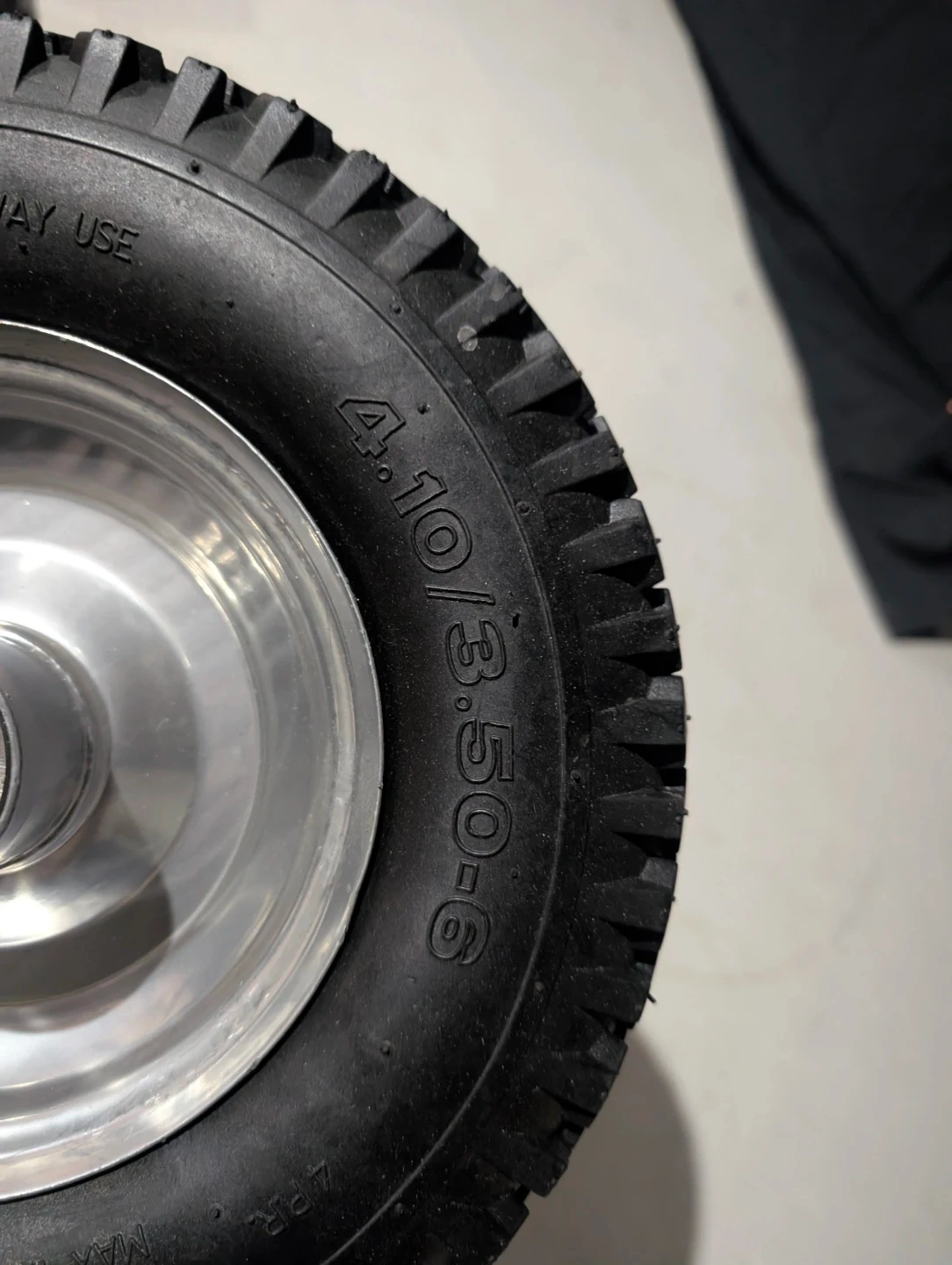 Two pneumatic tires with aluminium rims are included. These tires are size 4.10/3.50-6. They're suitable for equipment that requires durable wheels. Maximum inflation pressure is 30 PSI.