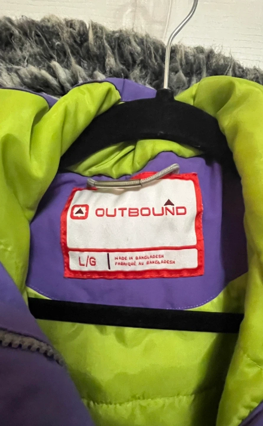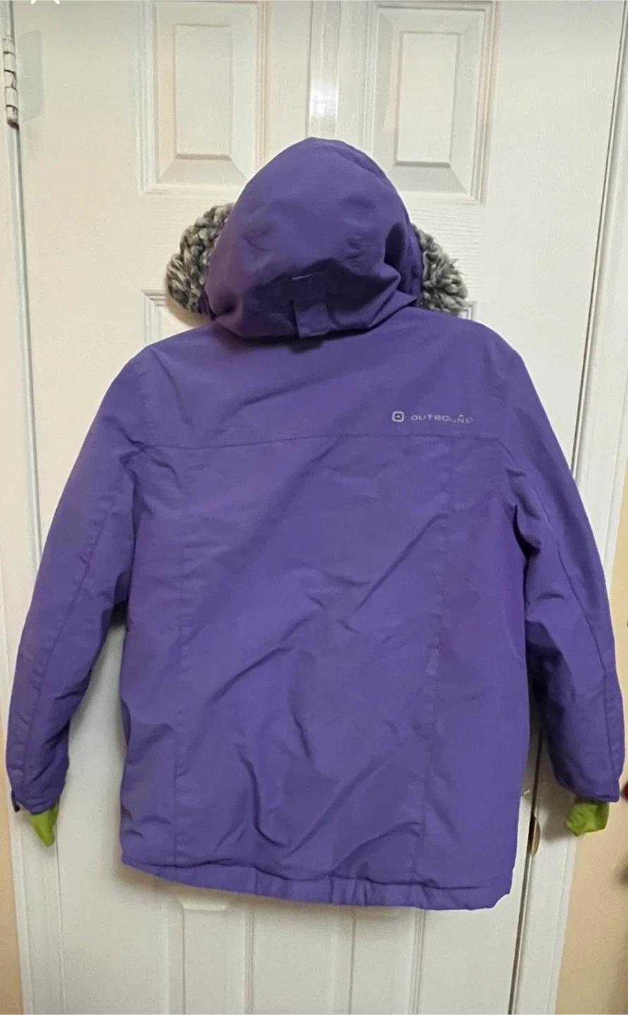 This is an Outbound purple winter jacket. It features a lime green lining and a faux fur-trimmed hood. The size is L/G kids or Small for adult. This jacket is suitable for colder weather activities.