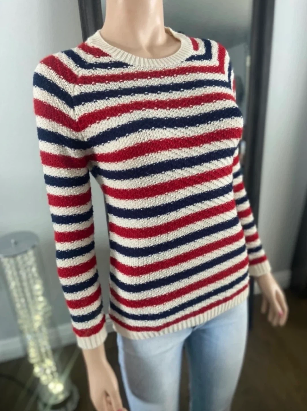 Cozy ZARA Knit sweater with a classic striped design! The colours are red, white, and navy blue