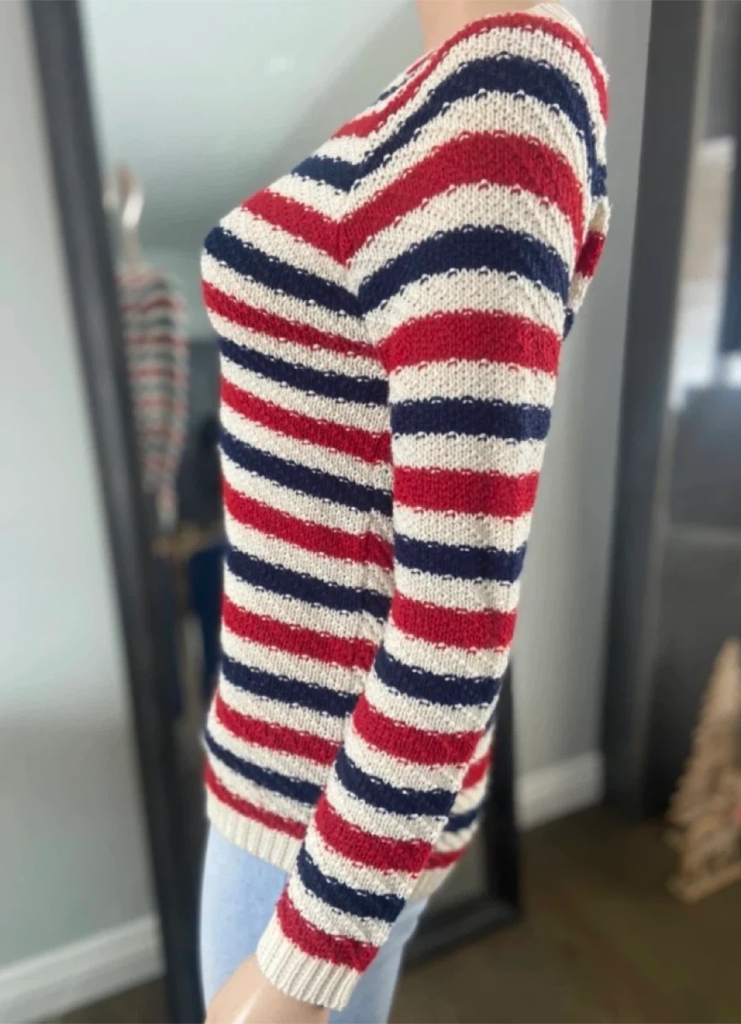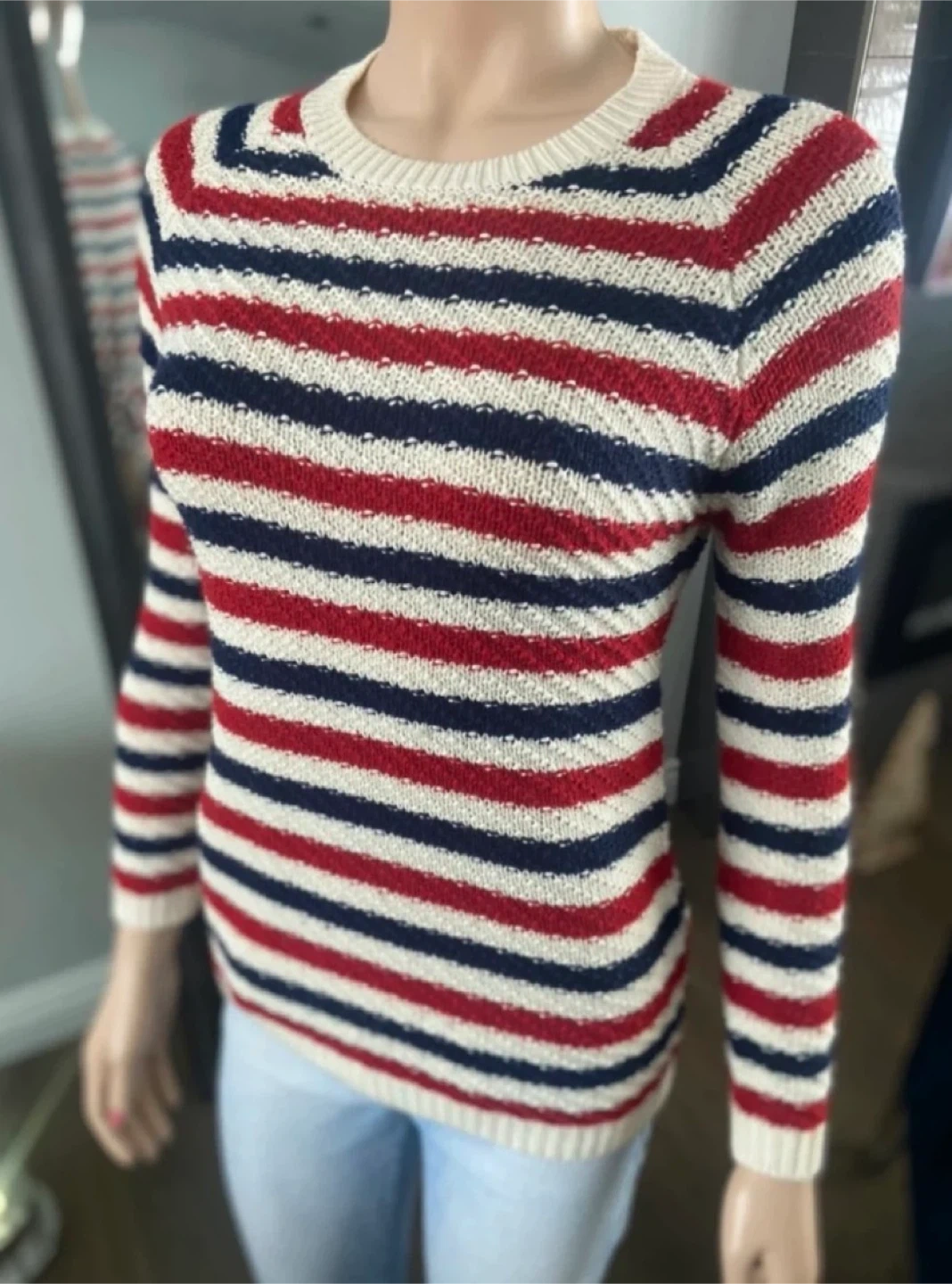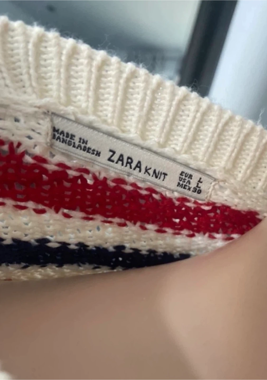 Cozy ZARA Knit sweater with a classic striped design! The colours are red, white, and navy blue