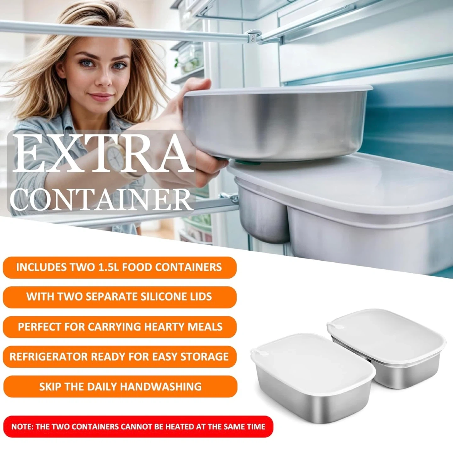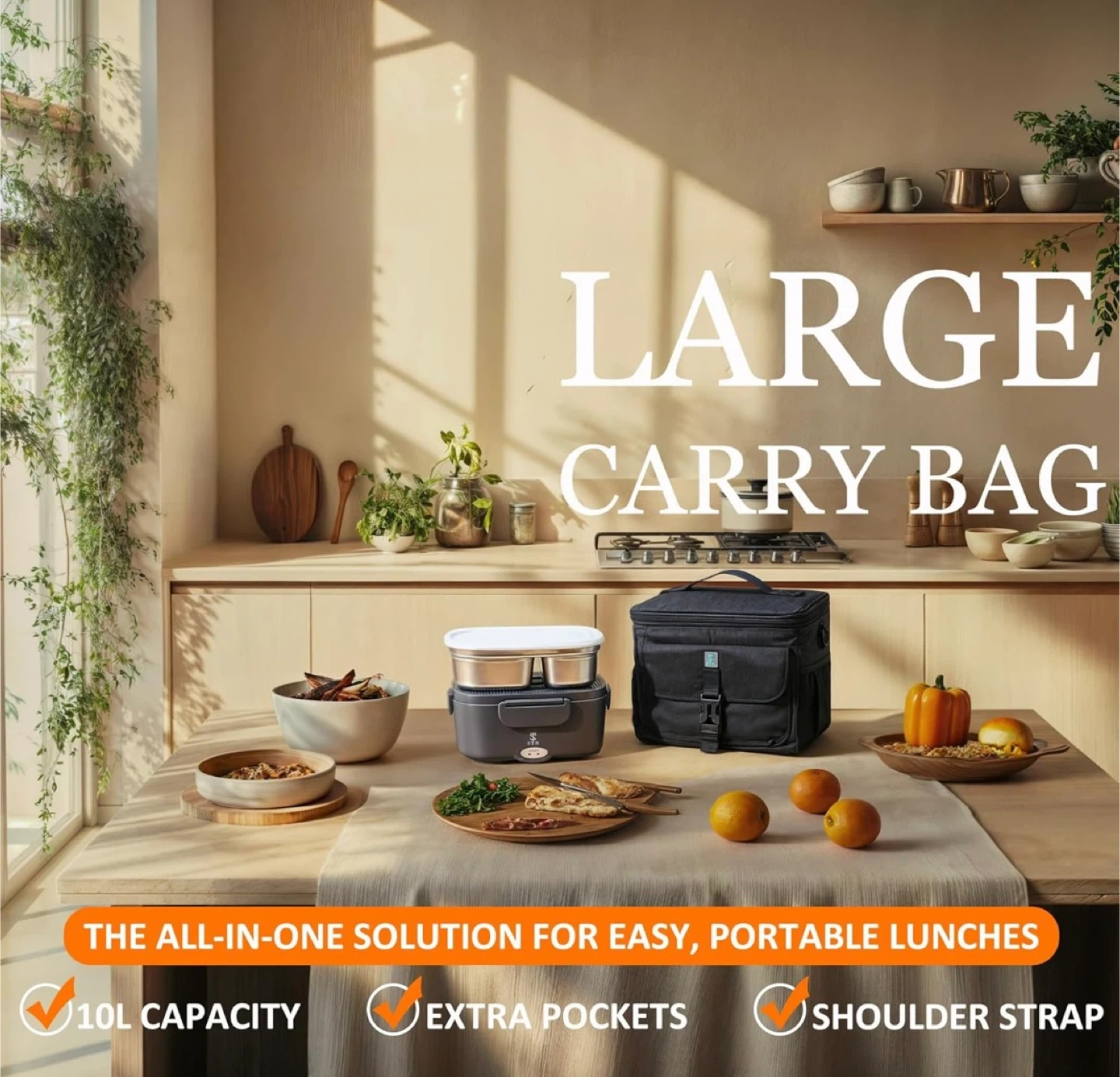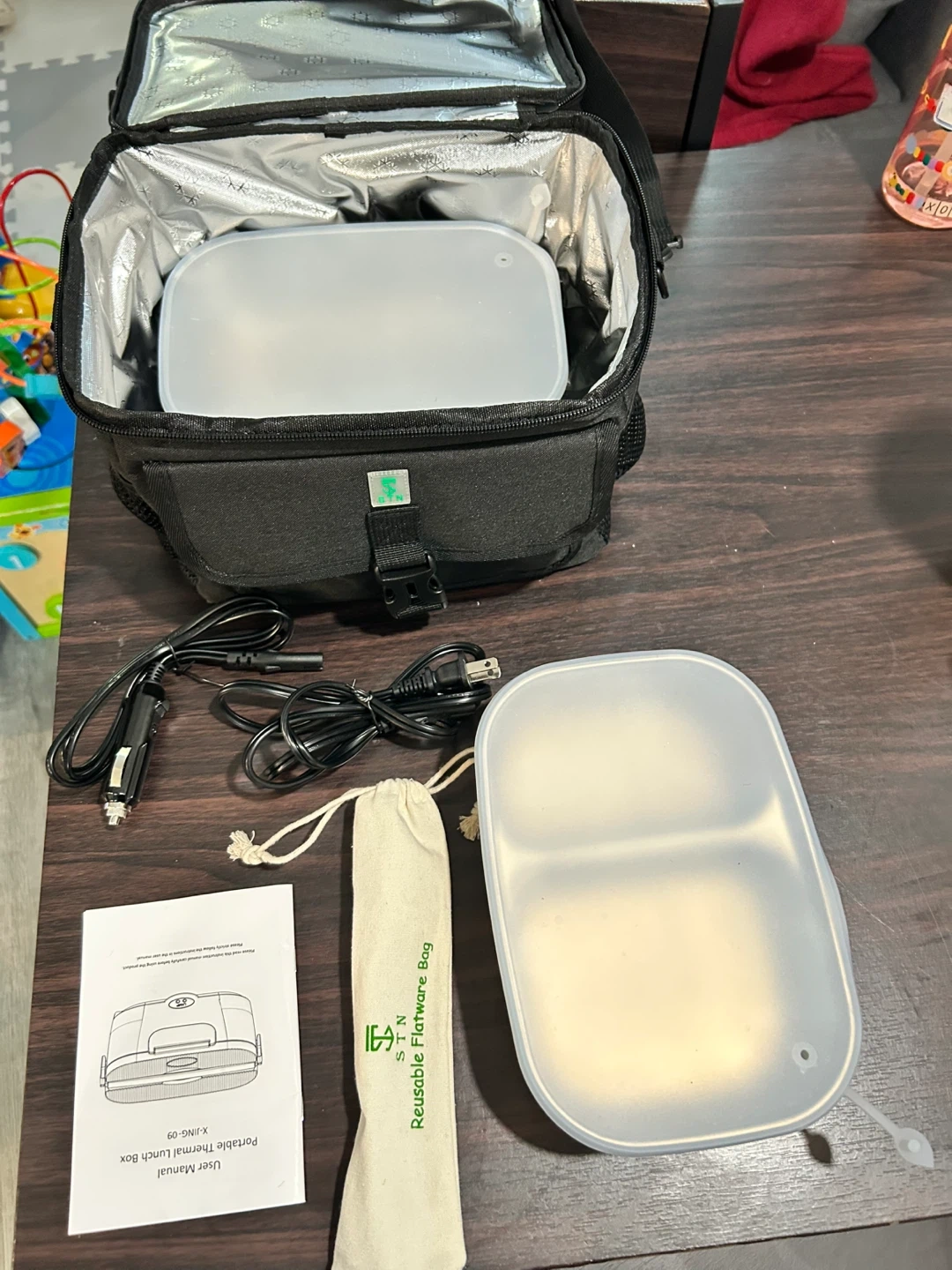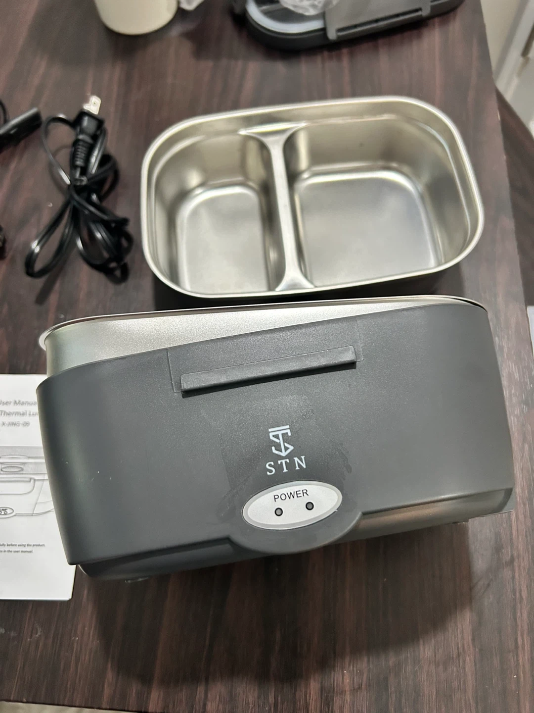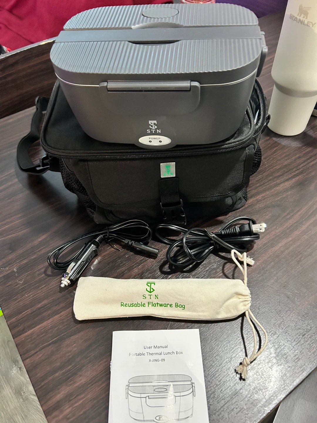 I'm selling a practically brand new STN Portable Thermal Lunch Box! It comes with everything you see in the pictures: the lunch box itself, two stainless steel containers, a carrying bag, and a reusable cutlery set with a bag. It's perfect for keeping your lunch warm on the go. It supports 110V, 24V, and 12V power options, making it versatile for home, truck, or car use