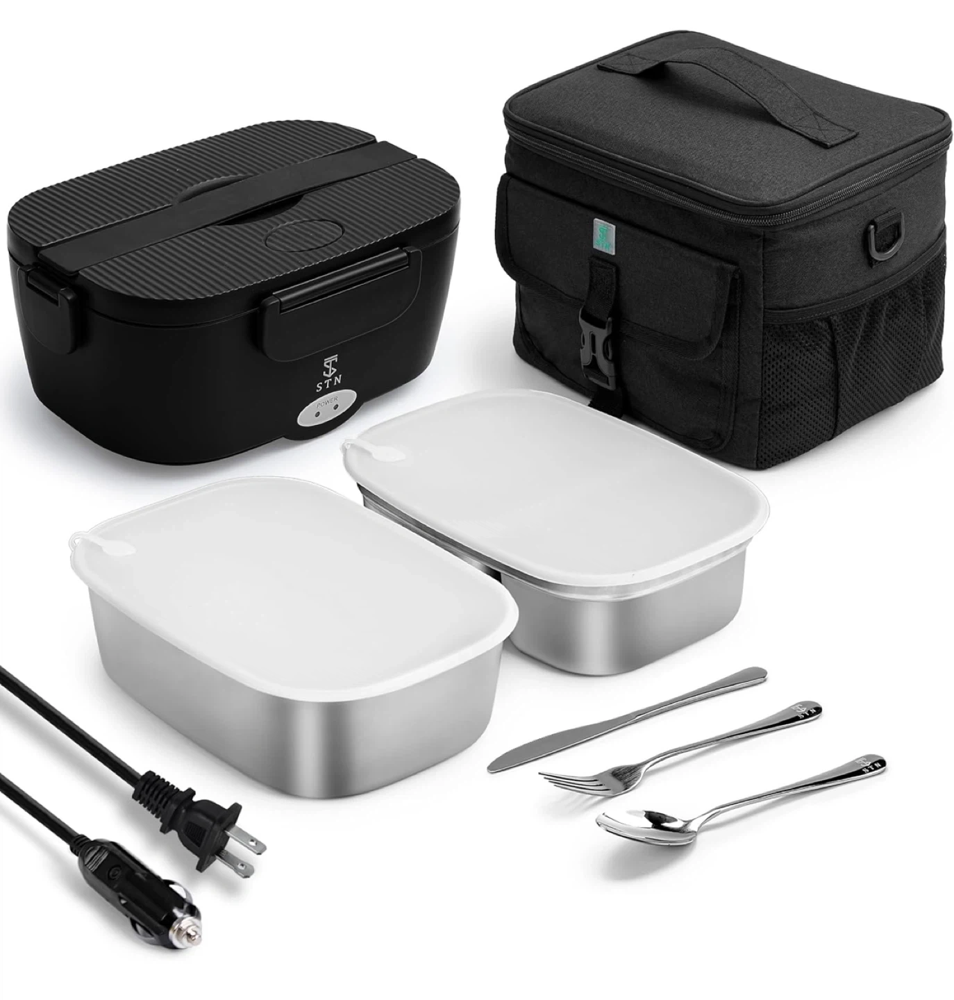 I'm selling a practically brand new STN Portable Thermal Lunch Box! It comes with everything you see in the pictures: the lunch box itself, two stainless steel containers, a carrying bag, and a reusable cutlery set with a bag. It's perfect for keeping your lunch warm on the go. It supports 110V, 24V, and 12V power options, making it versatile for home, truck, or car use