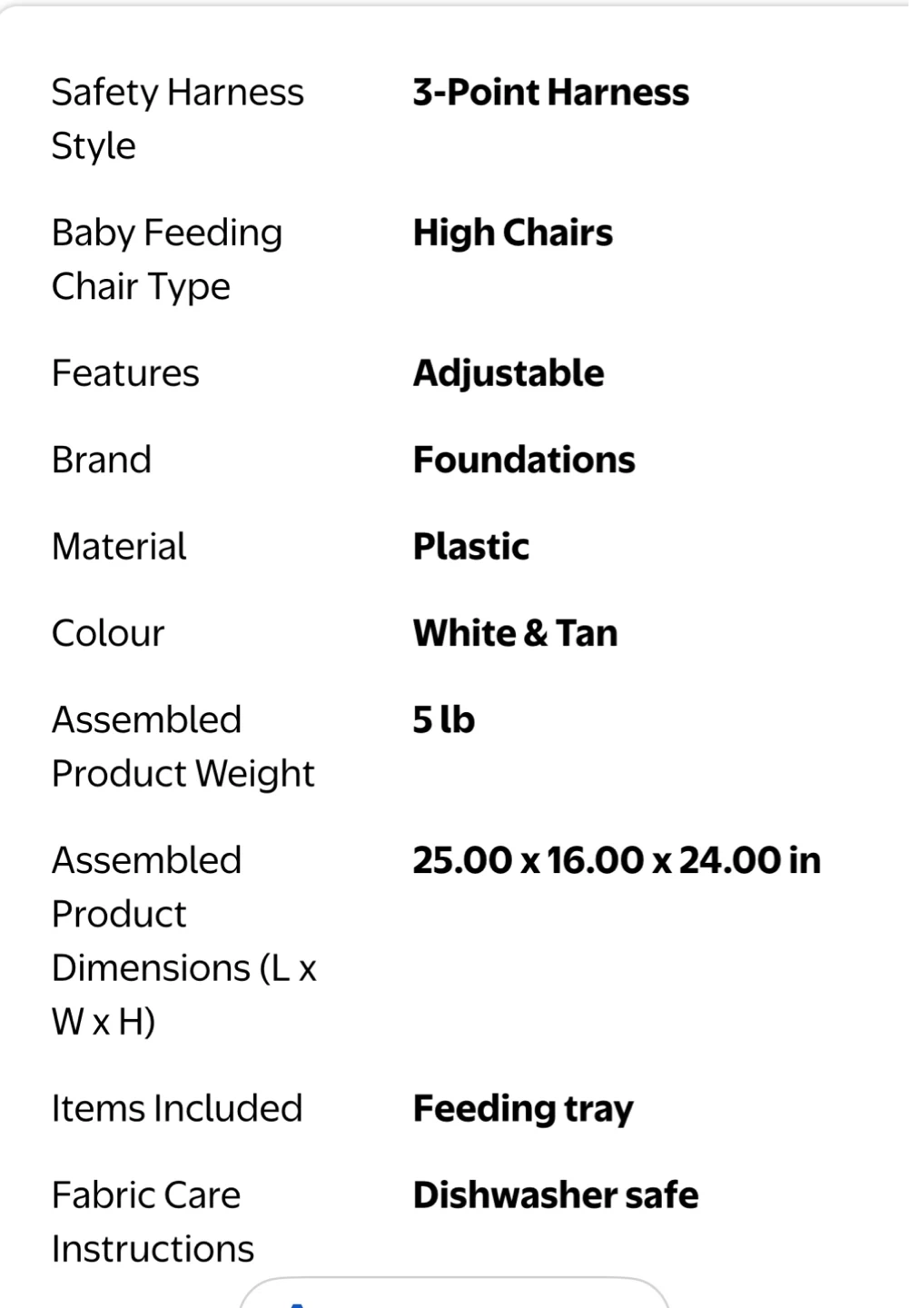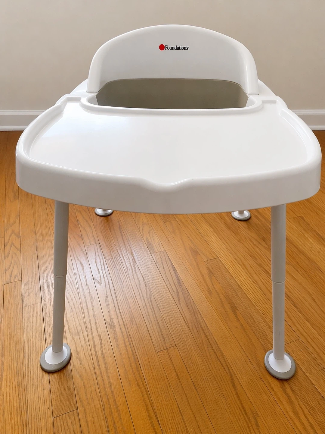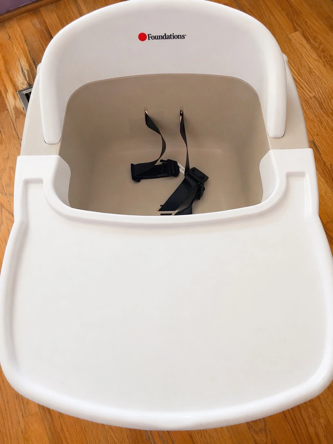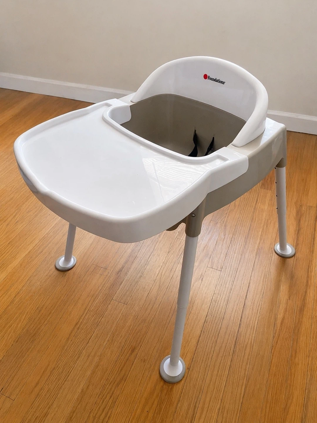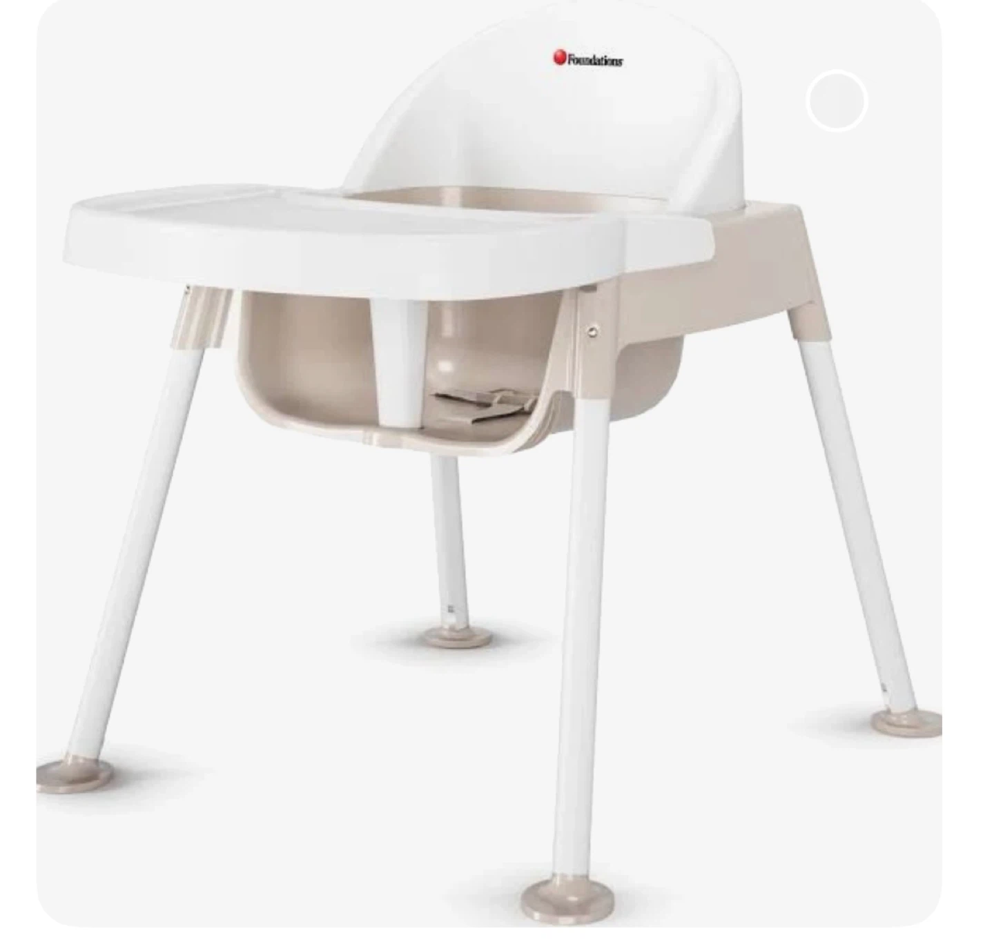 Foundations baby feeding chair in white and tan plastic. It features a 3-point safety harness and a dishwasher-safe feeding tray. The tray is removable for easy cleaning. It's adjustable and easy to assemble.
