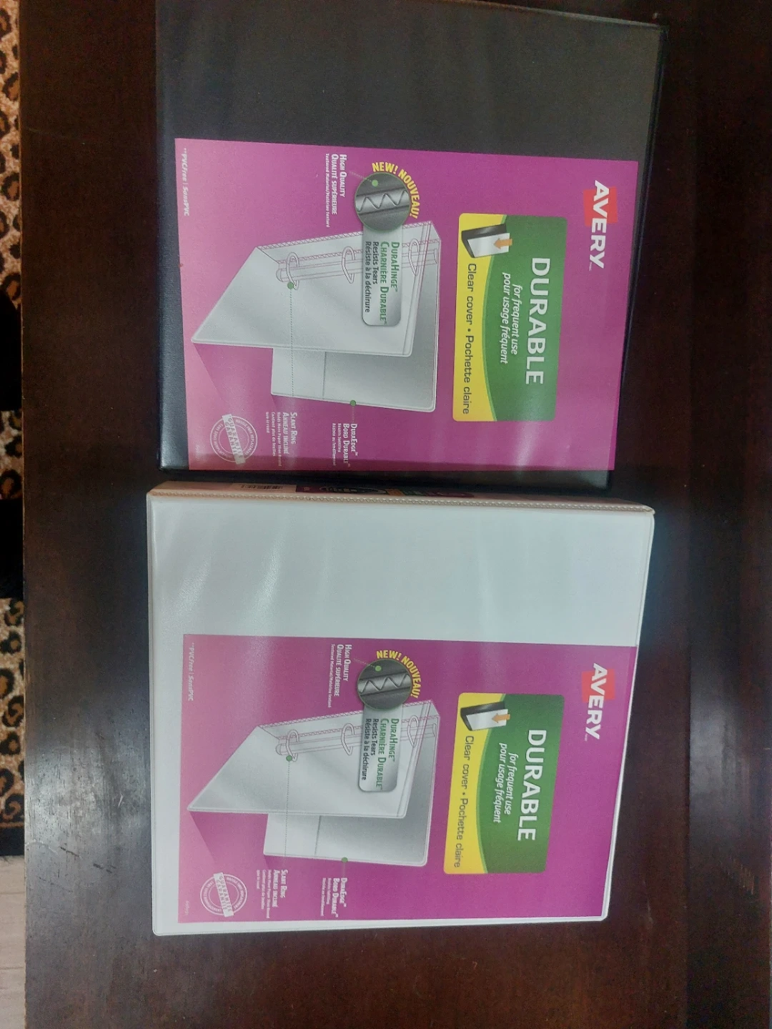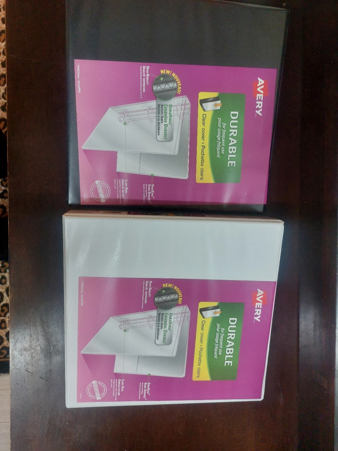 Selling a new pack of two Avery Durable View Binders! One is black and the other is white. These binders are great for frequent use and have a clear cover for customization