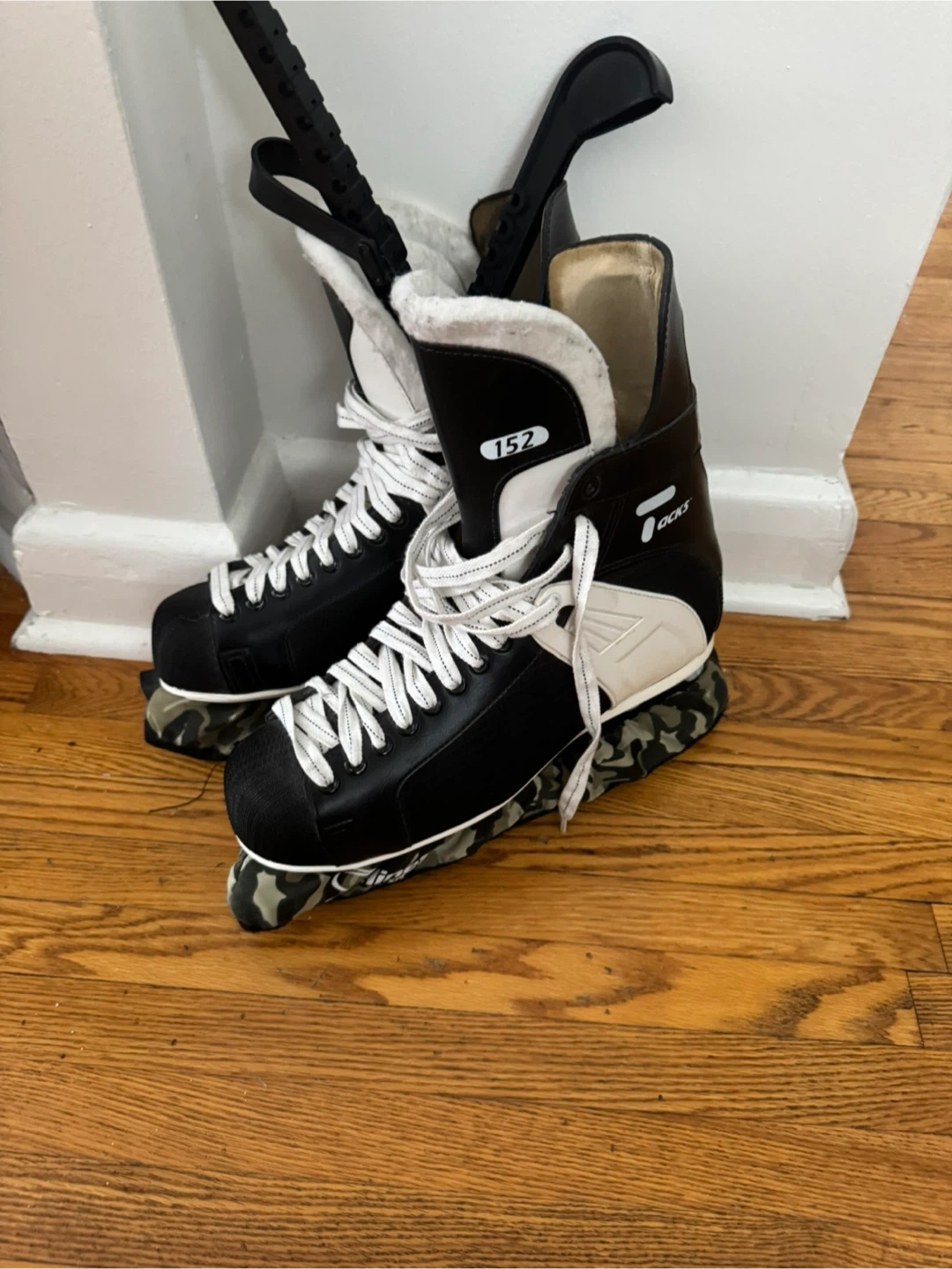 CCM Tacks hockey skates in black and white. Features white laces and fleece lining for comfort. Size 152 clearly marked. These skates are great for aspiring hockey players hitting the ice!