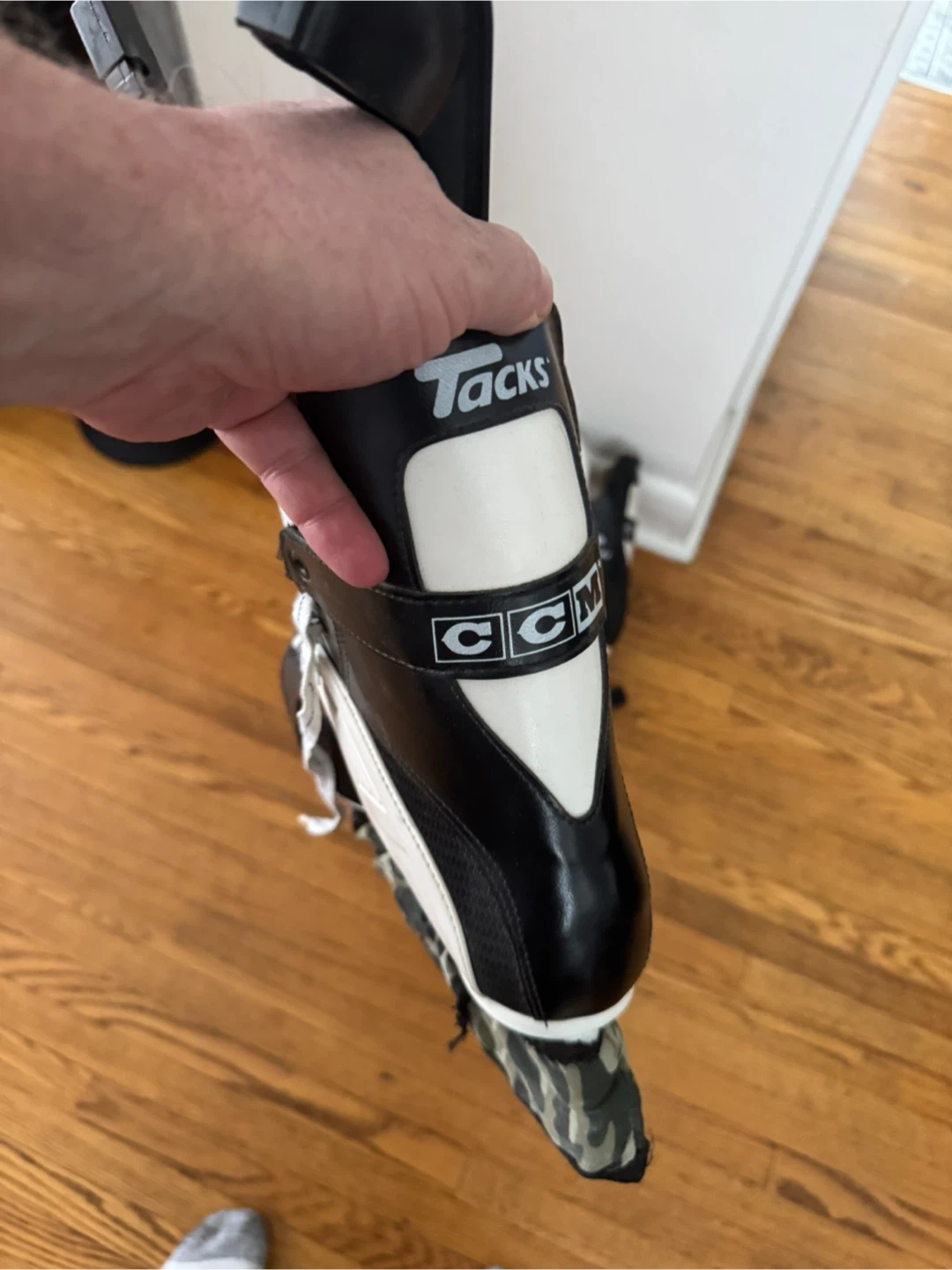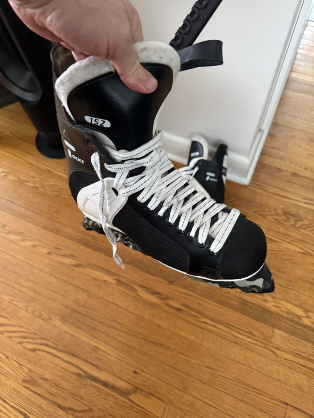 CCM Tacks hockey skates in black and white. Features white laces and fleece lining for comfort. Size 152 clearly marked. These skates are great for aspiring hockey players hitting the ice!