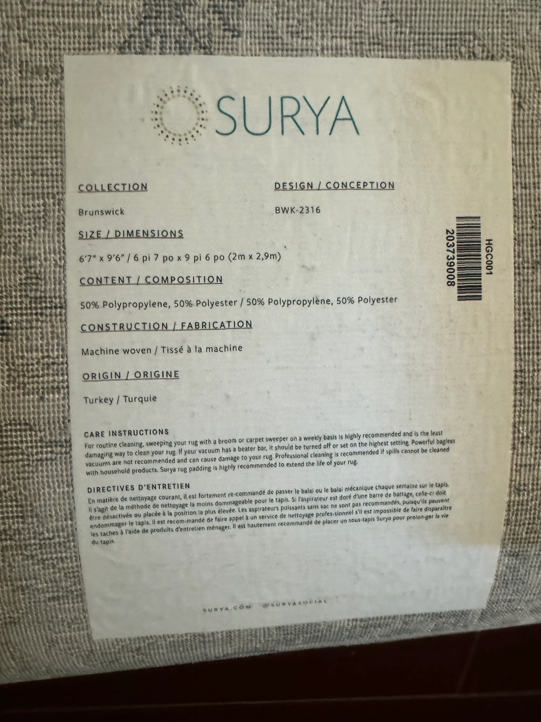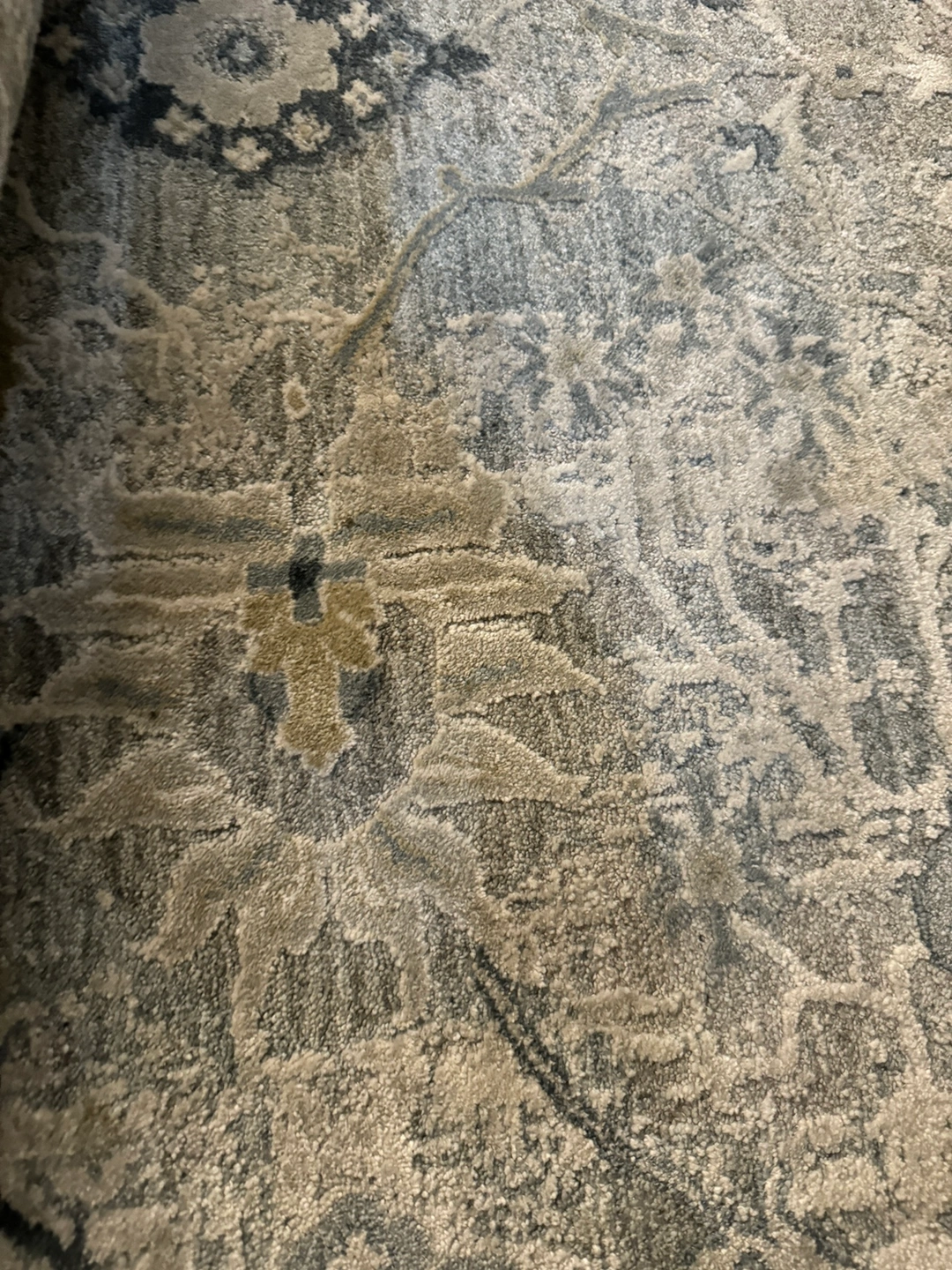 Beautiful patterned rug in grey and beige tones. Would look great in a living room or bedroom. Measures approximately 8'x10'.