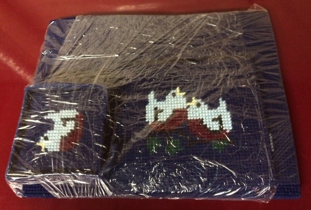Set of navy blue placemats, trivets, and coasters with a bluebird motif. Includes 4 placemats (approx. 14" x 11"), 2 trivets (approx. 8" x 7"), 4 coasters (approx. 4" x 4"), and a coaster holder. This is a one-of-a-kind custom design made of yarn stitched on plastic canvas. The coasters may have been lightly used, but the placemats and trivets appear unused. They are hand washable. Perfect for protecting your furniture and adding a touch of nature-inspired decor to your kitchen, dining room, or living room. Great for bird and nature lovers! Asking $15 for the set. Located near the Burlington/Oakville border.