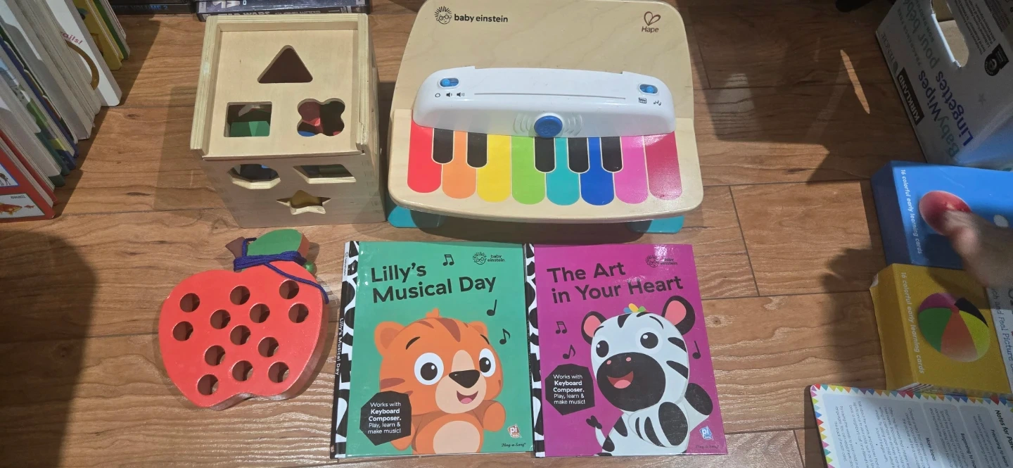 This set includes a Baby Einstein piano with colorful keys, two Baby Einstein books: 'Lilly's Musical Day' and 'The Art in Your Heart'; a Melissa and Doug Shapes Sorting Cube and a wooden lacing/threading apple toy.