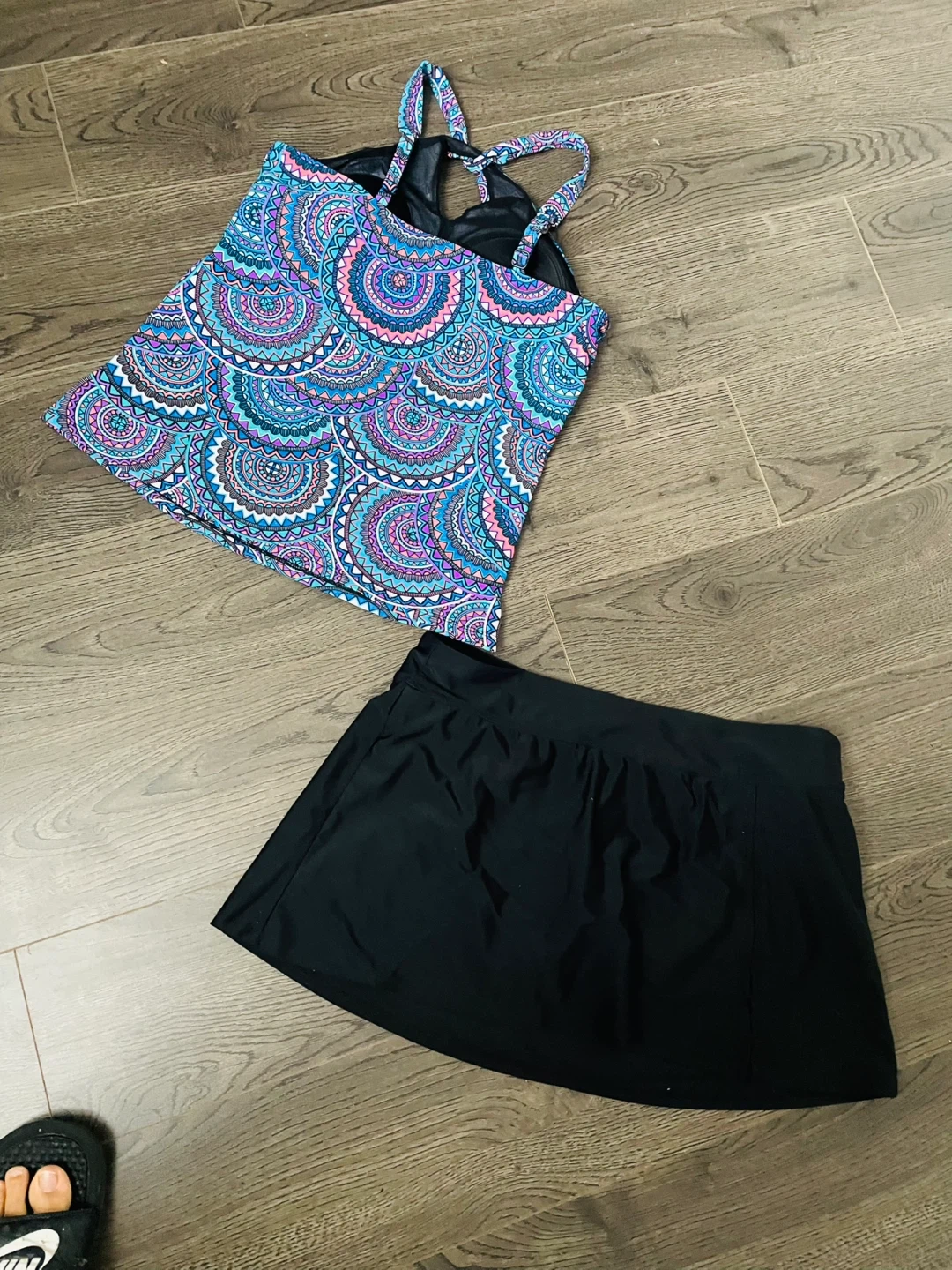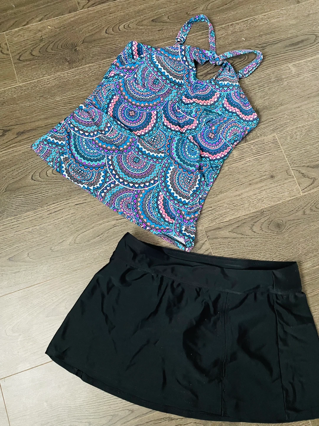 This two-piece tankini set features a colourful patterned tank top with adjustable straps and a black swim skirt. It's perfect for swimming or lounging by the pool. Made from comfortable, quick-drying fabric.