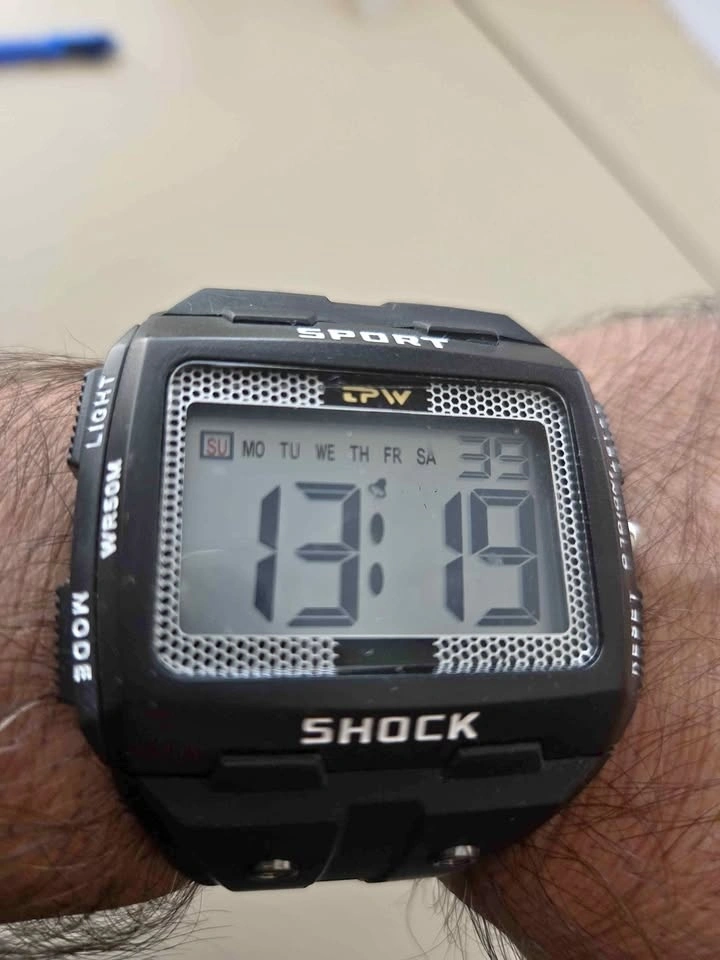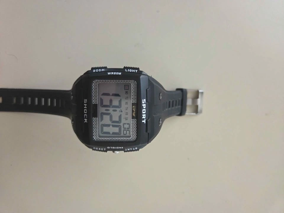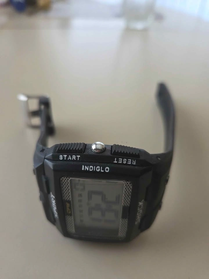 This is a new, sporty men's watch with an indiglo light. It is water-resistant up to 50 meters and features light, start, and reset buttons. Feel free to message if you have any questions!