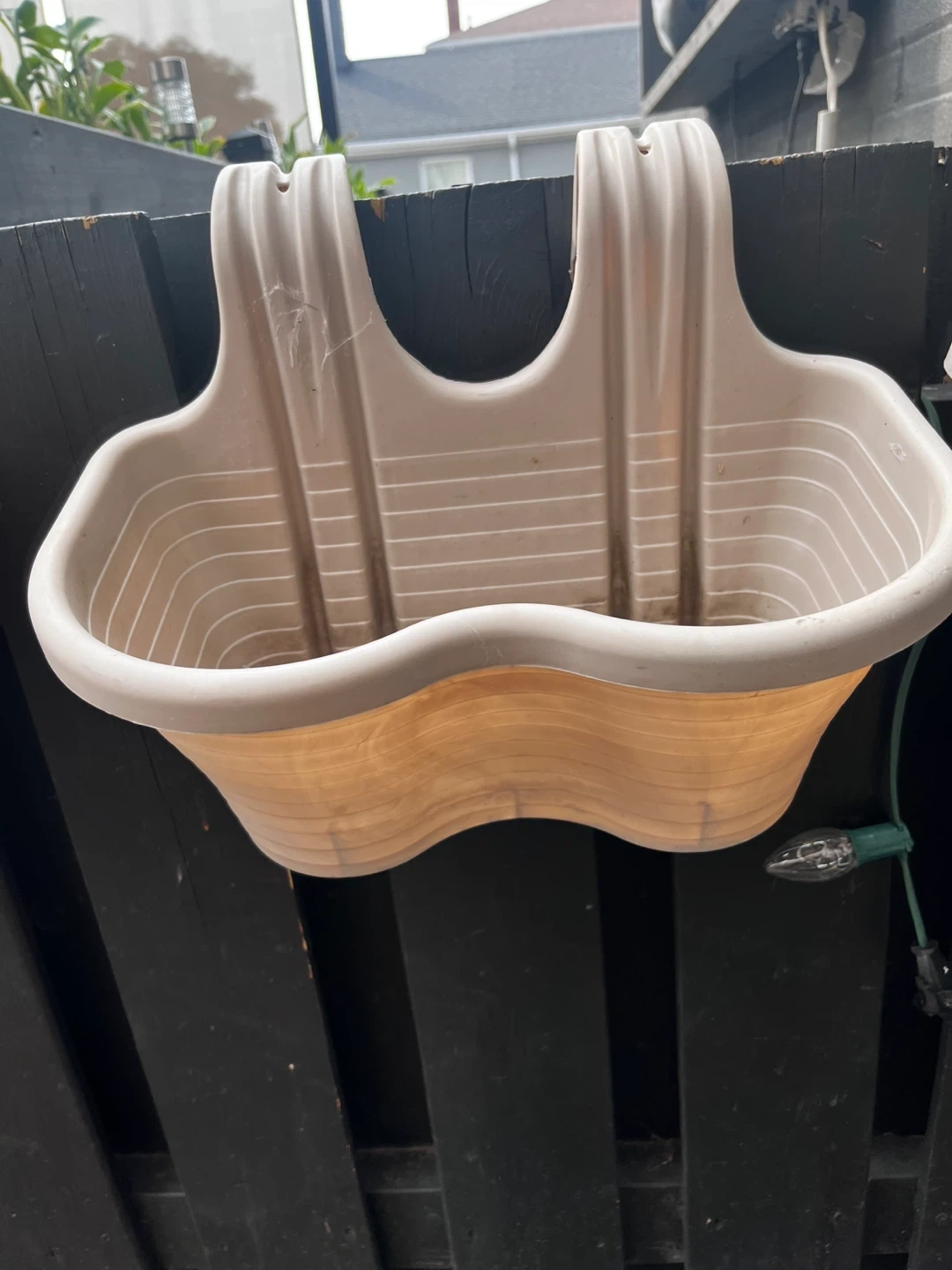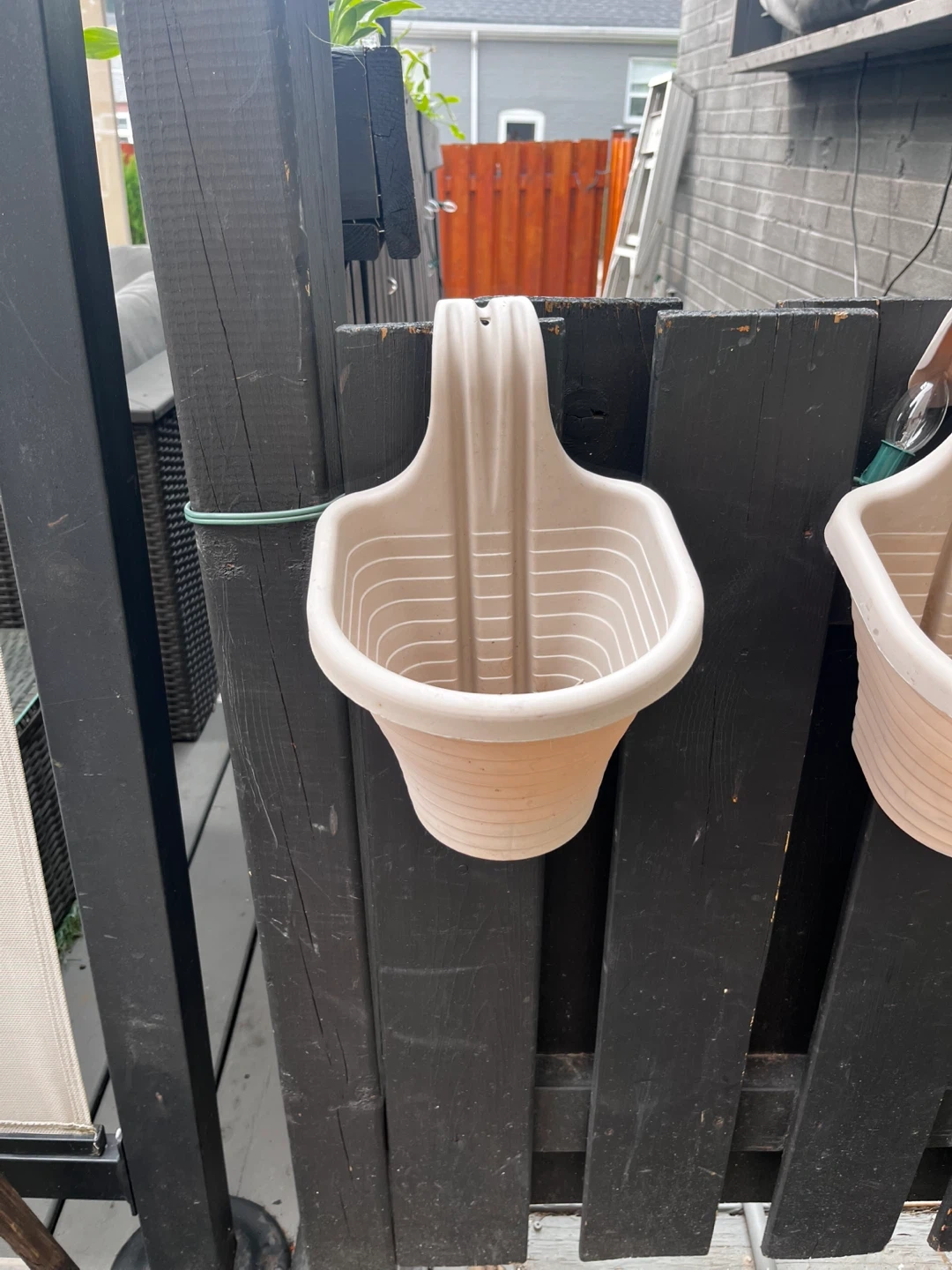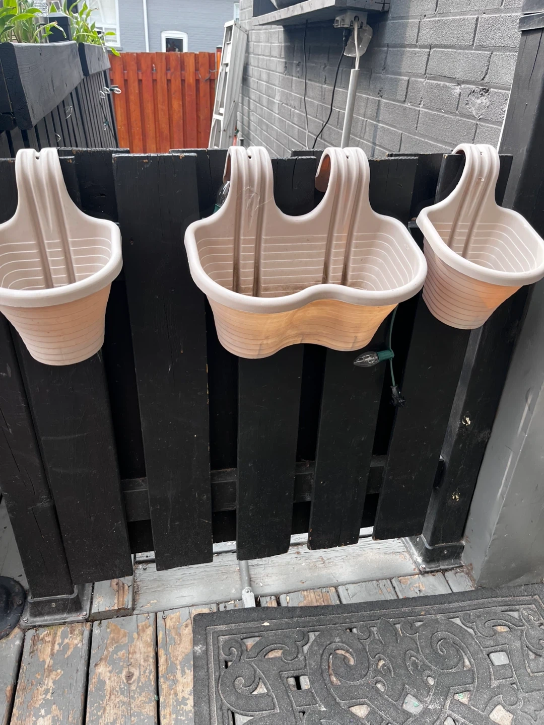 This set includes three beige hanging planters. They're made of durable plastic and designed for outdoor use. These planters are great for adding some I greenery to your fence or railing!