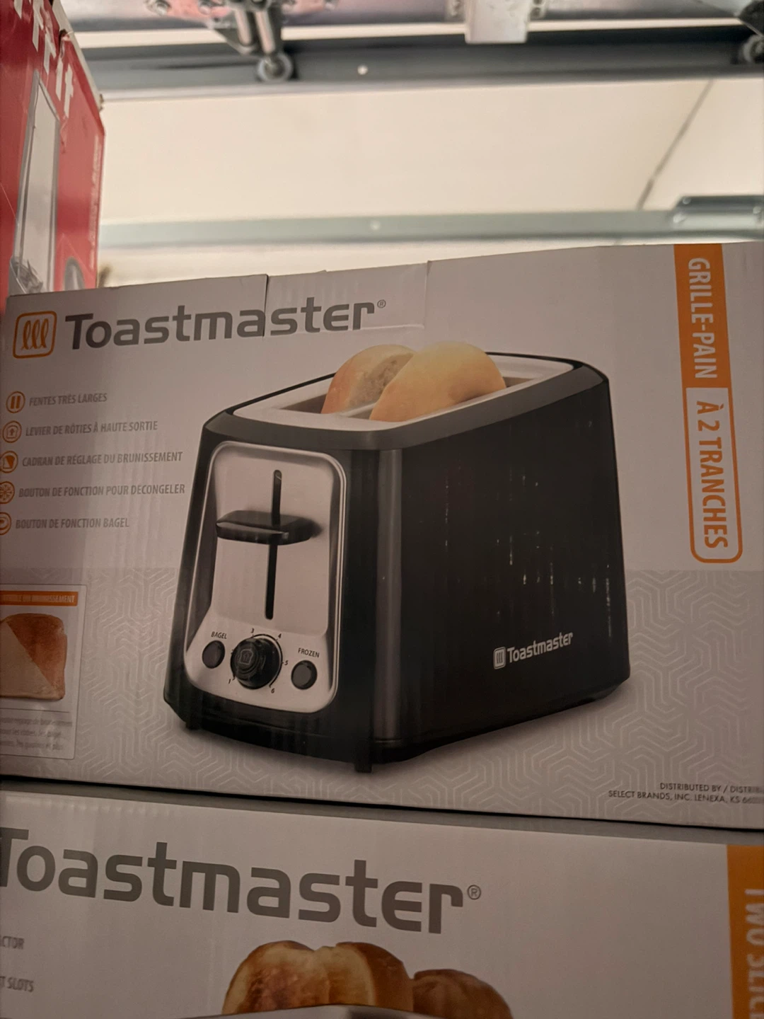 This is a Toastmaster 2-slice toaster. It features wide slots for different bread types. It also has a defrost function and bagel setting for convenience. You'll get perfectly toasted bread every time!