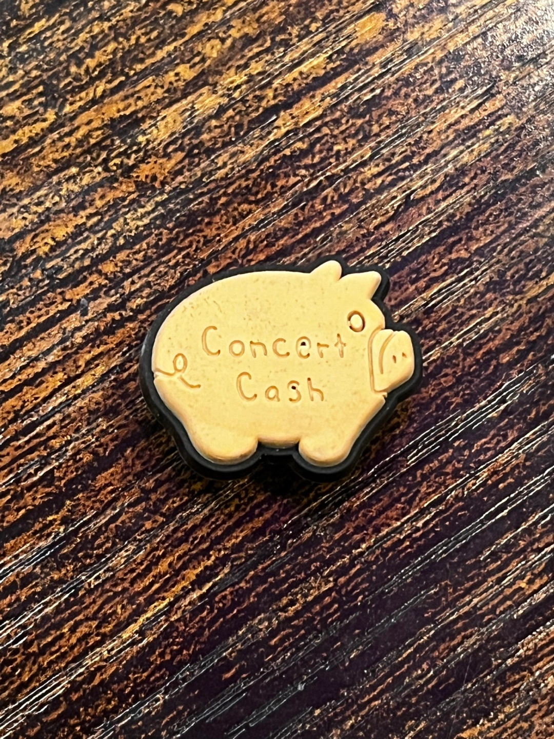 A small piggy bank charm. It is beige with a black outline. It features the words 'Concert Cash' on it. The charm can be added to your shoes for some extra personality and style.