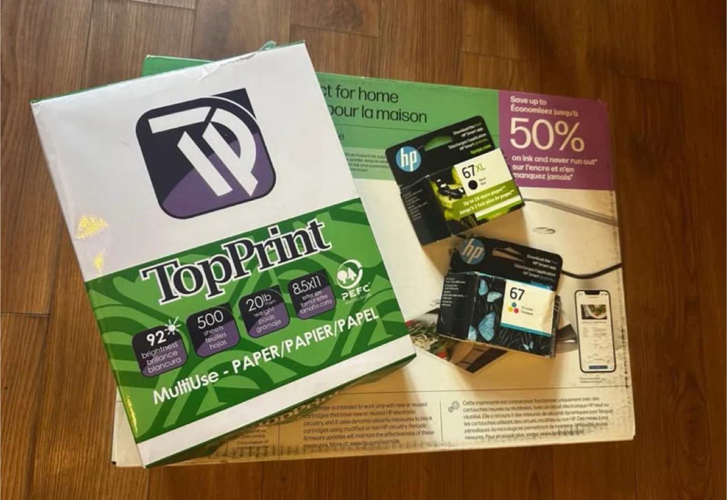 Selling an HP Deskjet 2855e printer, perfect for home use! It's designed for simple, stress-free printing, and is instant ink ready. Also included are HP 67 and 67XL ink cartridges. Great for everyday printing needs!