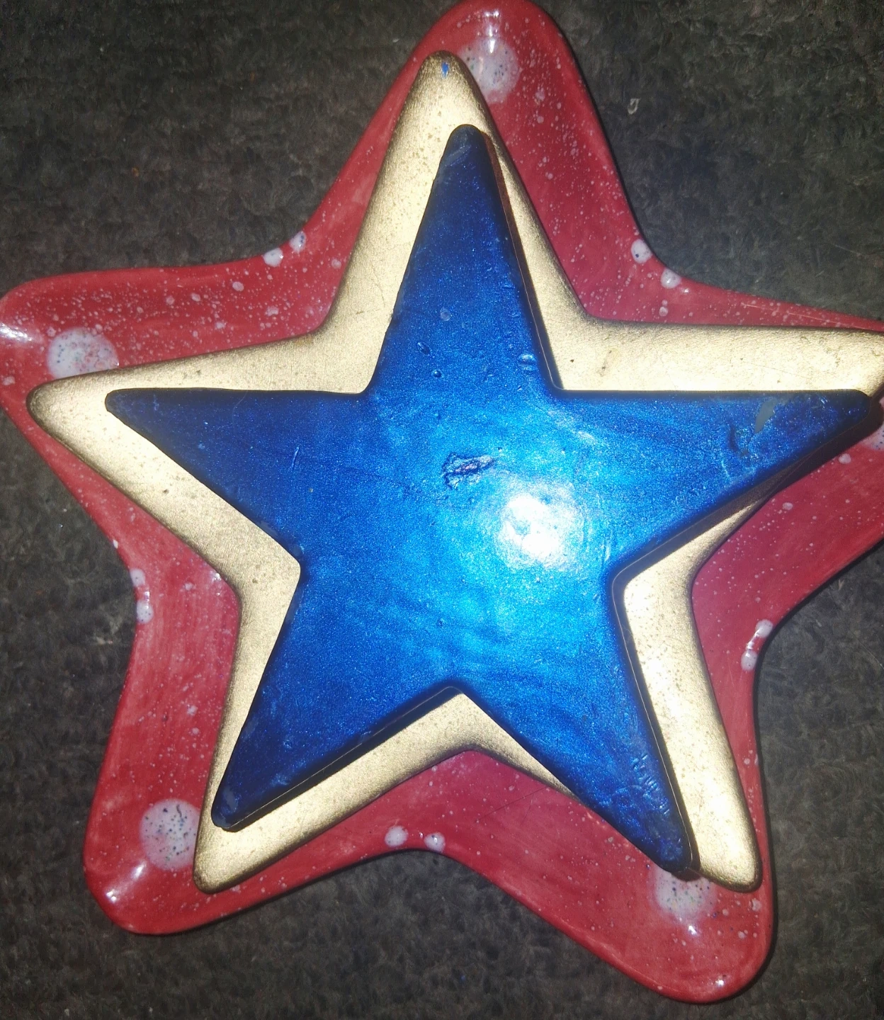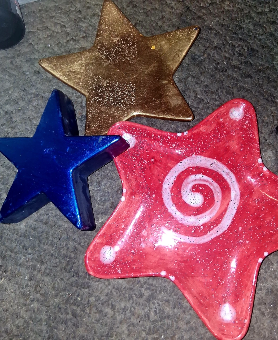Set of three decorative star-shaped dishes. Includes one red dish with a white swirl and speckles, one gold dish, and one blue dish. These could be used for trinkets or small items. Pick up only unless near intersection of Oxford and Gammage Street.