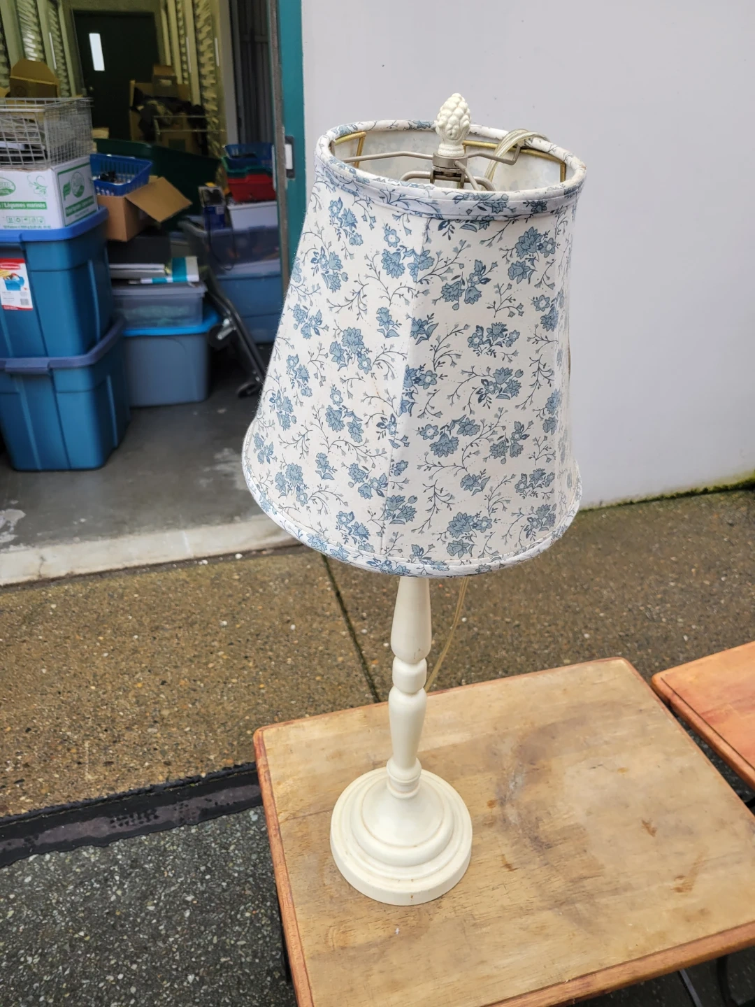A charming table lamp featuring a cream-coloured base and a bell-shaped lampshade with a delicate blue floral pattern. The lamp uses a standard bulb (not included).