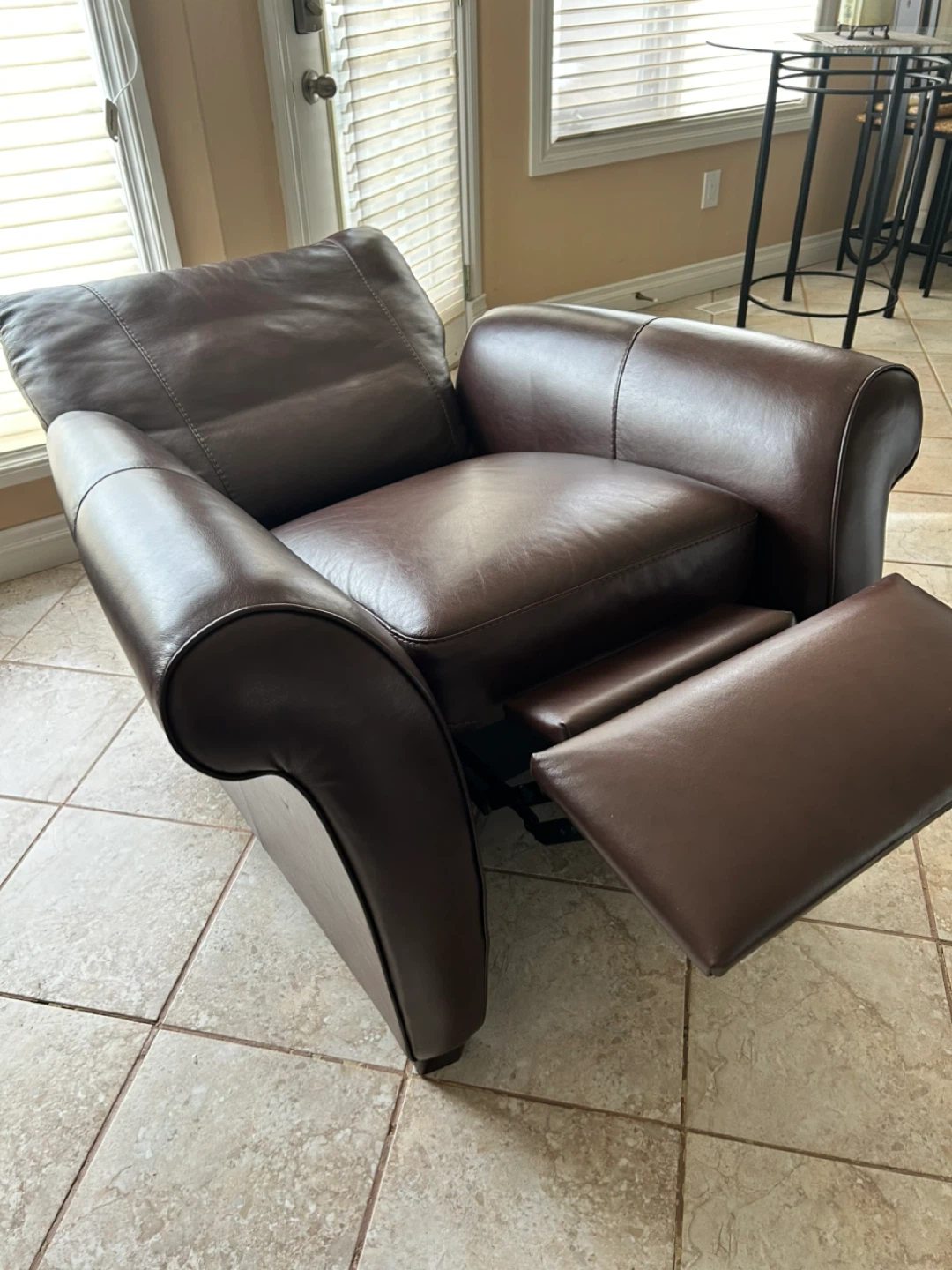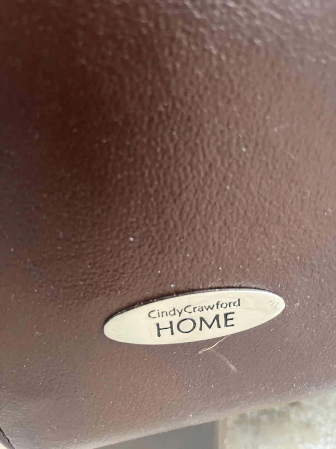 Comfortable brown leather reclining armchair from Cindy Crawford HOME. It's upholstered in rich, dark brown leather with a plush seat and rolled arms. This chair offers a classic look for any living space.