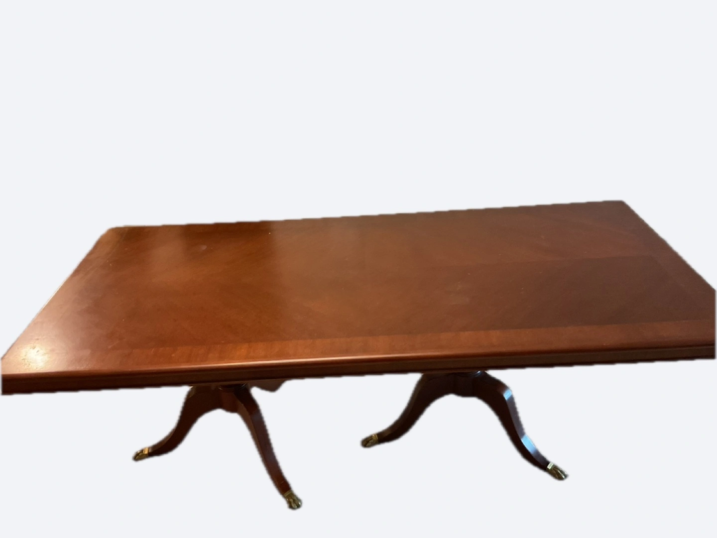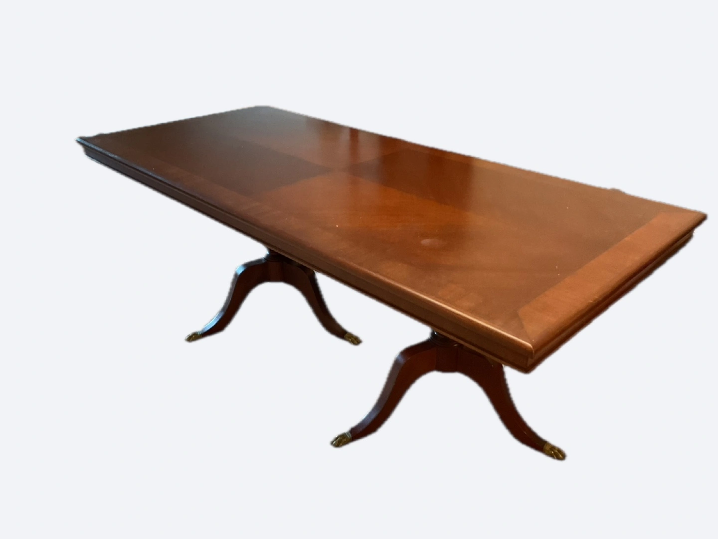 Large rectangular dining table. Cherry wood finish. Pedestal base with brass feet. Great for formal dining.