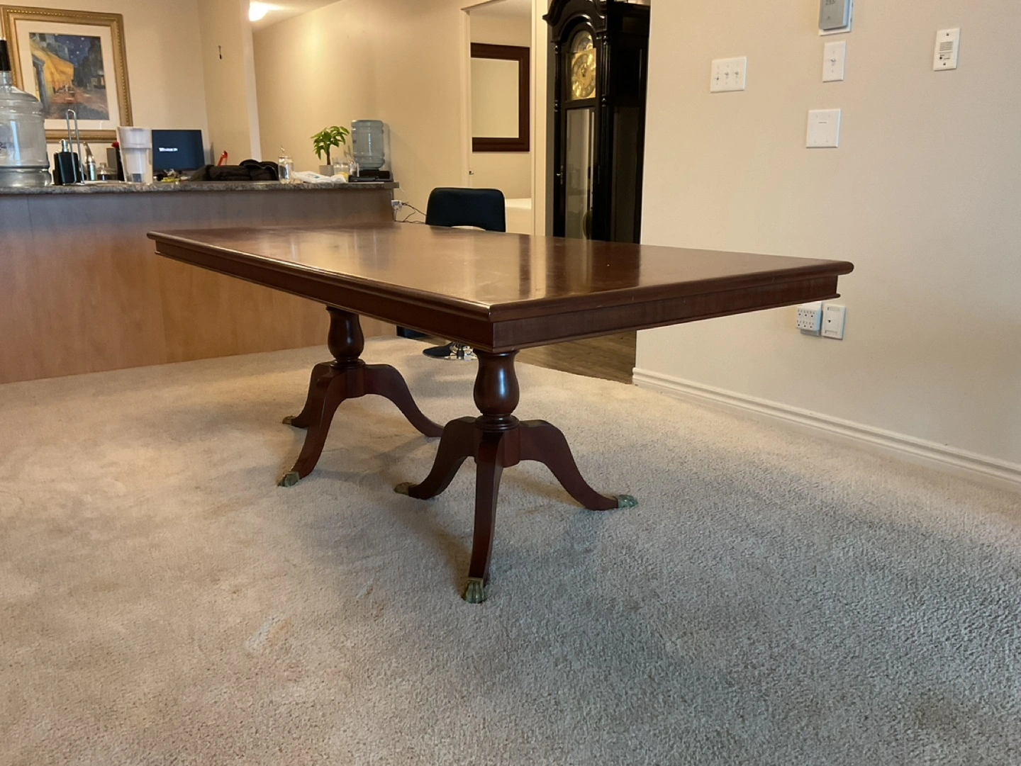 Large rectangular dining table. Cherry wood finish. Pedestal base with brass feet. Great for formal dining.