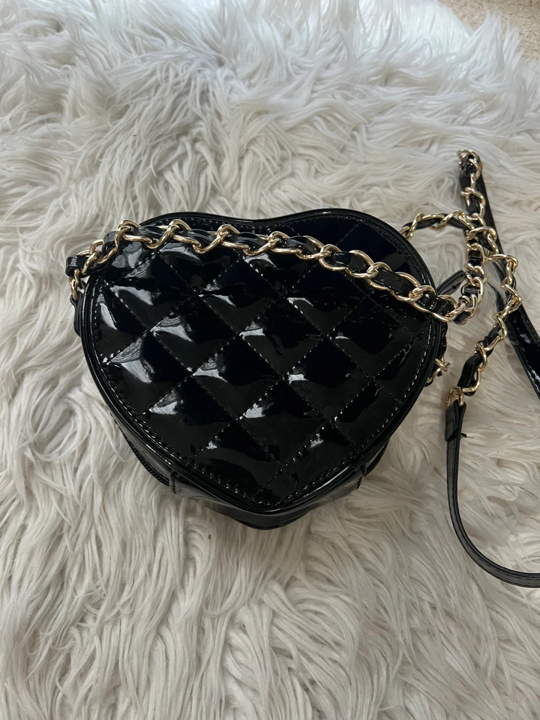 Shiny black patent heart-shaped purse. It's quilted with a gold chain strap. Fully lined interior with zipper closure.