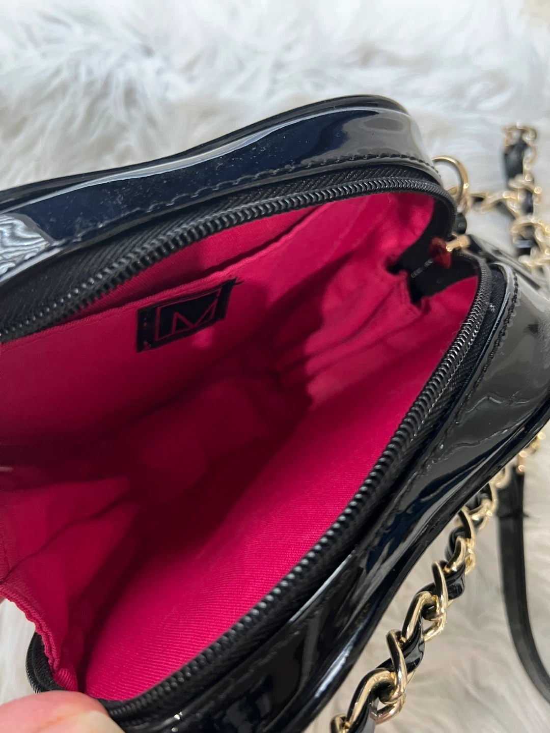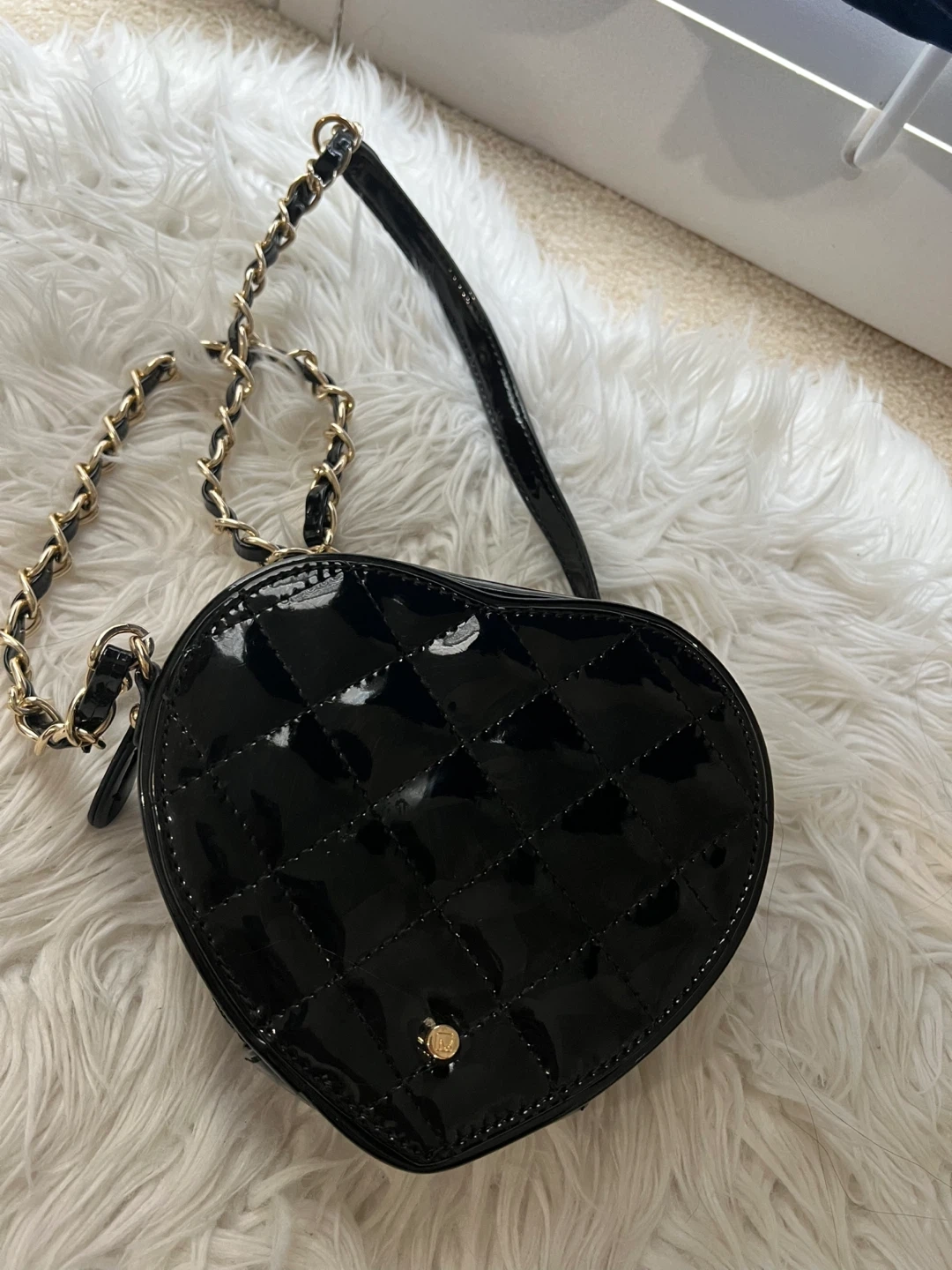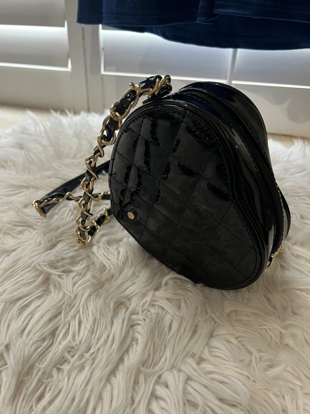 Shiny black patent heart-shaped purse. It's quilted with a gold chain strap. Fully lined interior with zipper closure.