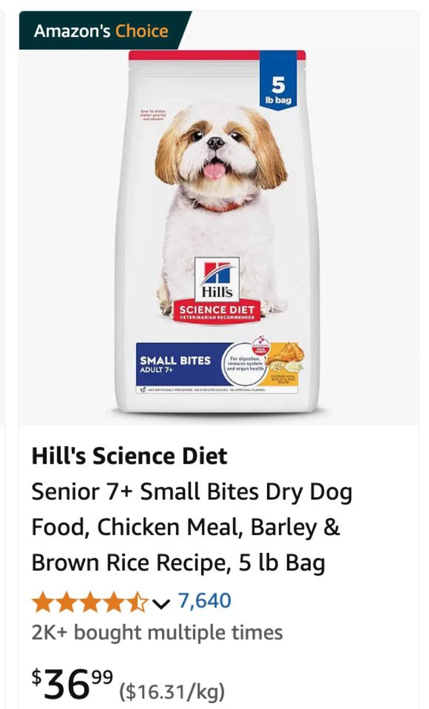 Hill's® Science Diet® Adult 7+ Small Bites Chicken Meal, Barley & Rice Recipe dog food new and sealed. 5lbs / 2.26 kg
