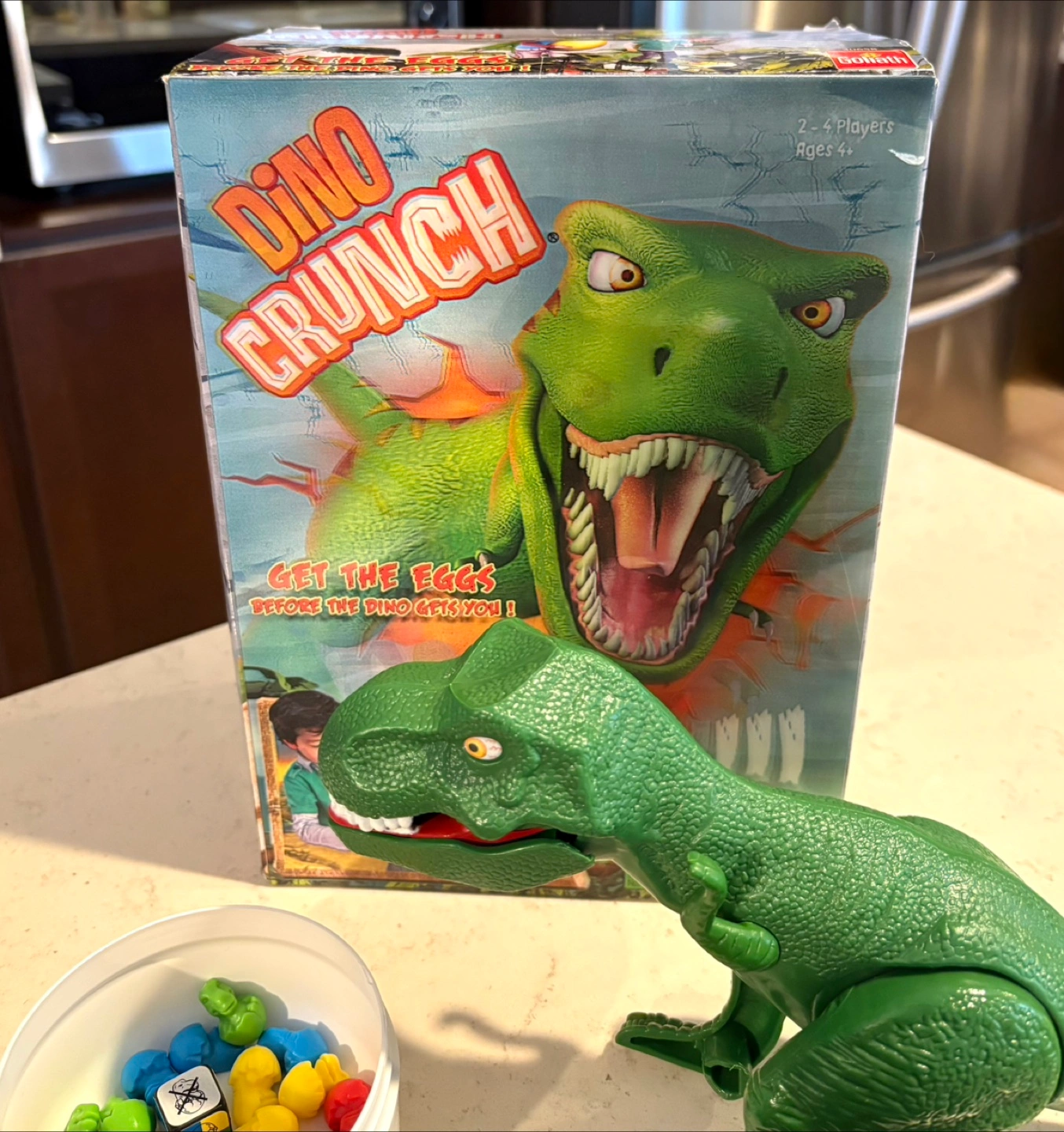 Dino Crunch is a thrilling board game for 2-4 players. Get the eggs before the dino gets you! It's for ages 4 and up. Includes the game, dice, and dino figure.