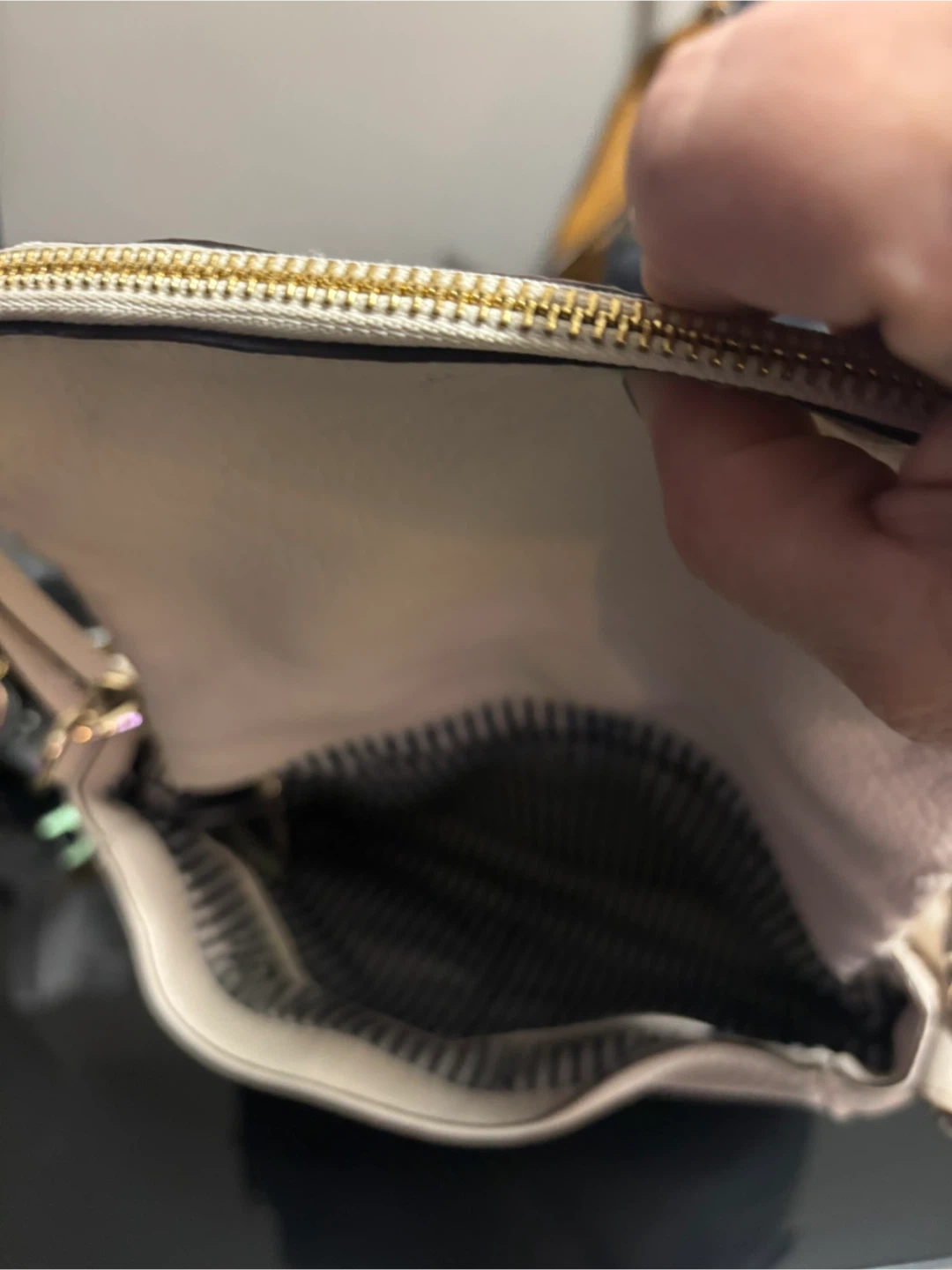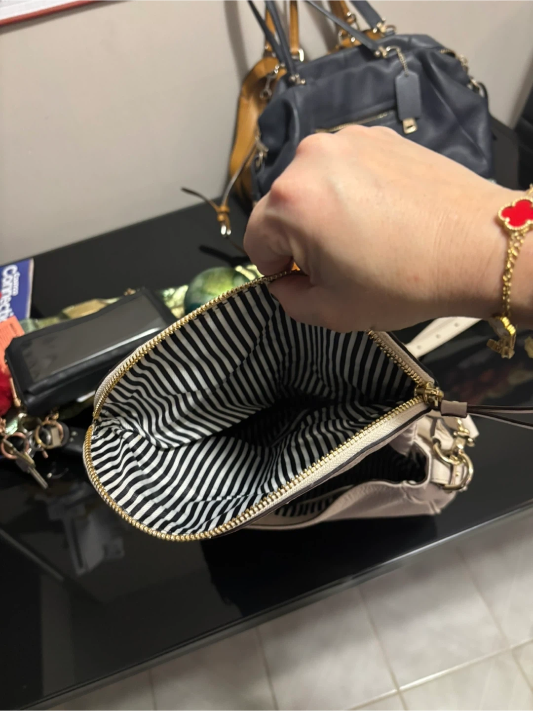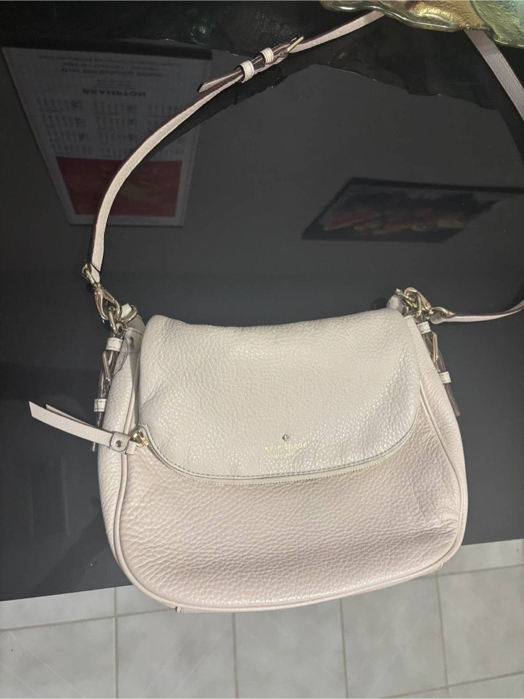 This is a light beach pebbled leather crossbody bag by Kate Spade. It has a zip-around closure and an adjustable strap. It's a versatile bag for everyday use.