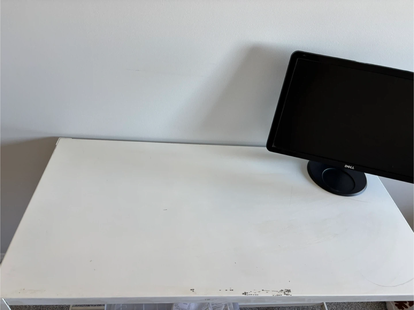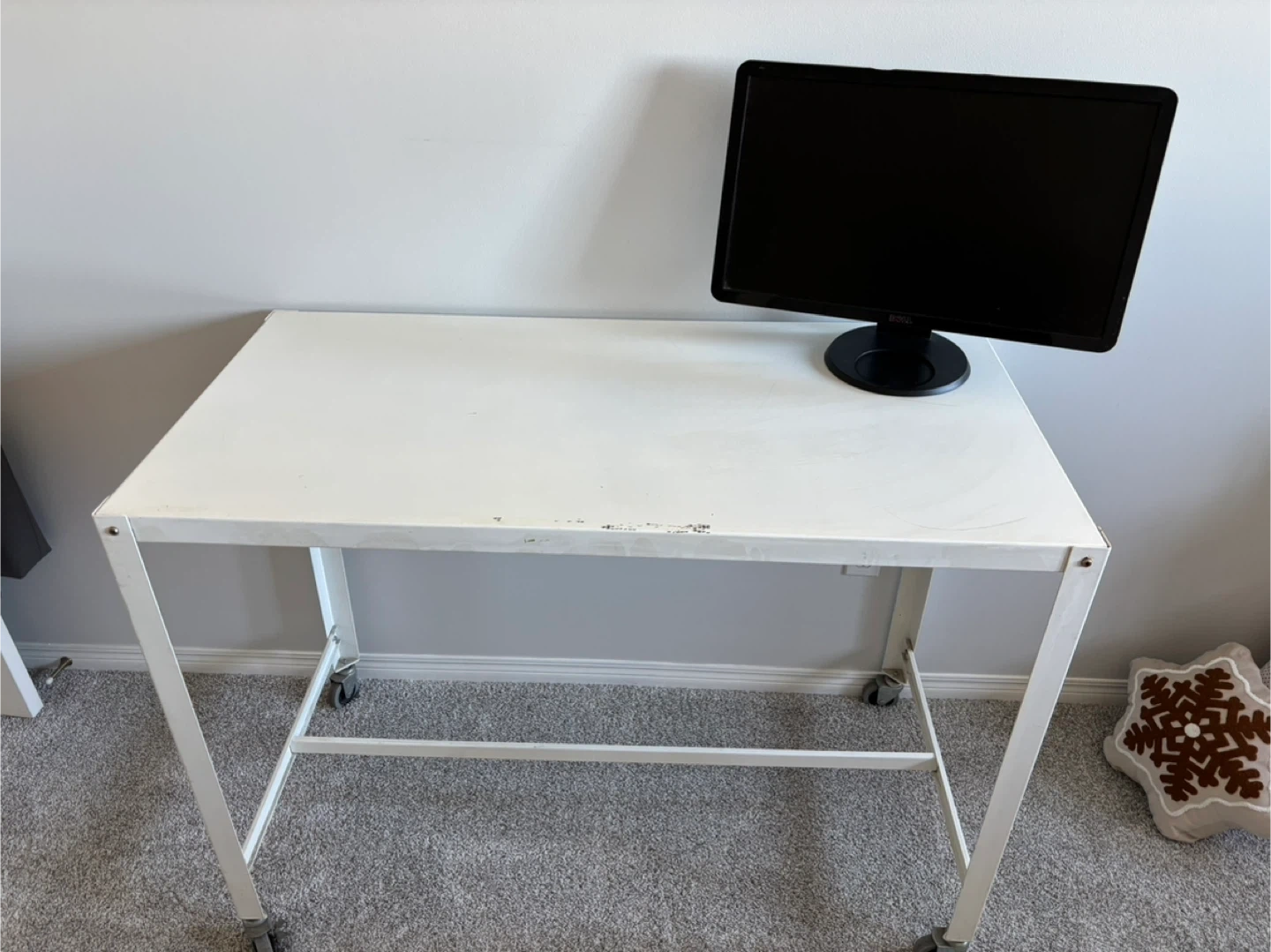 This is a simple white metal desk on wheels. It has a sturdy frame and a spacious surface. The wheels allow for easy repositioning. It's great for a home office or craft area!