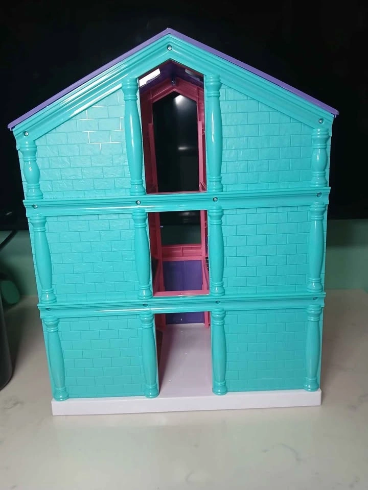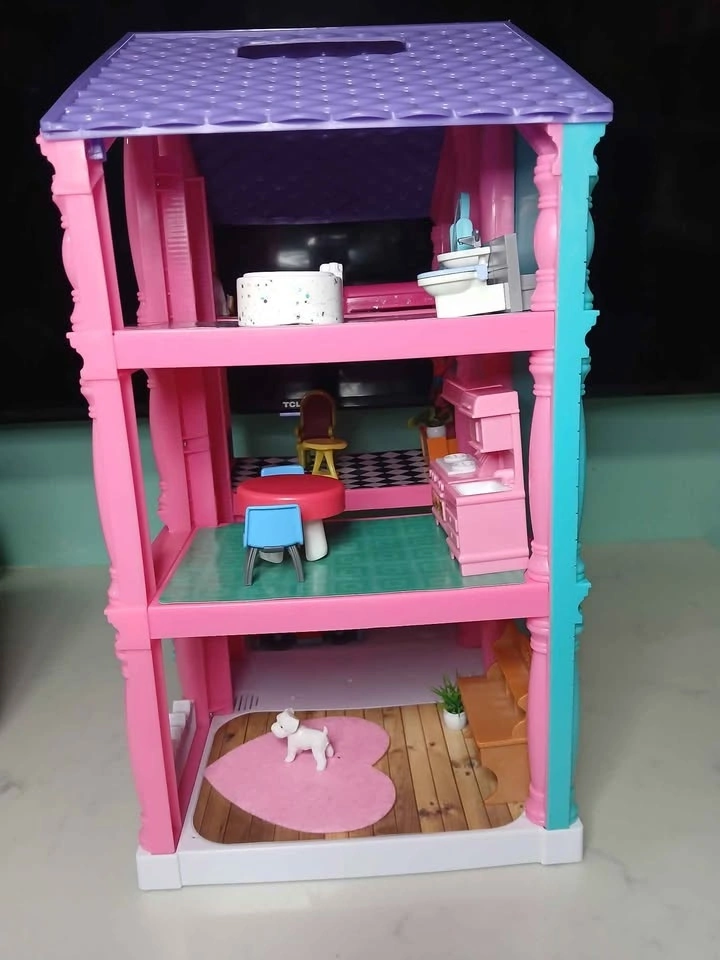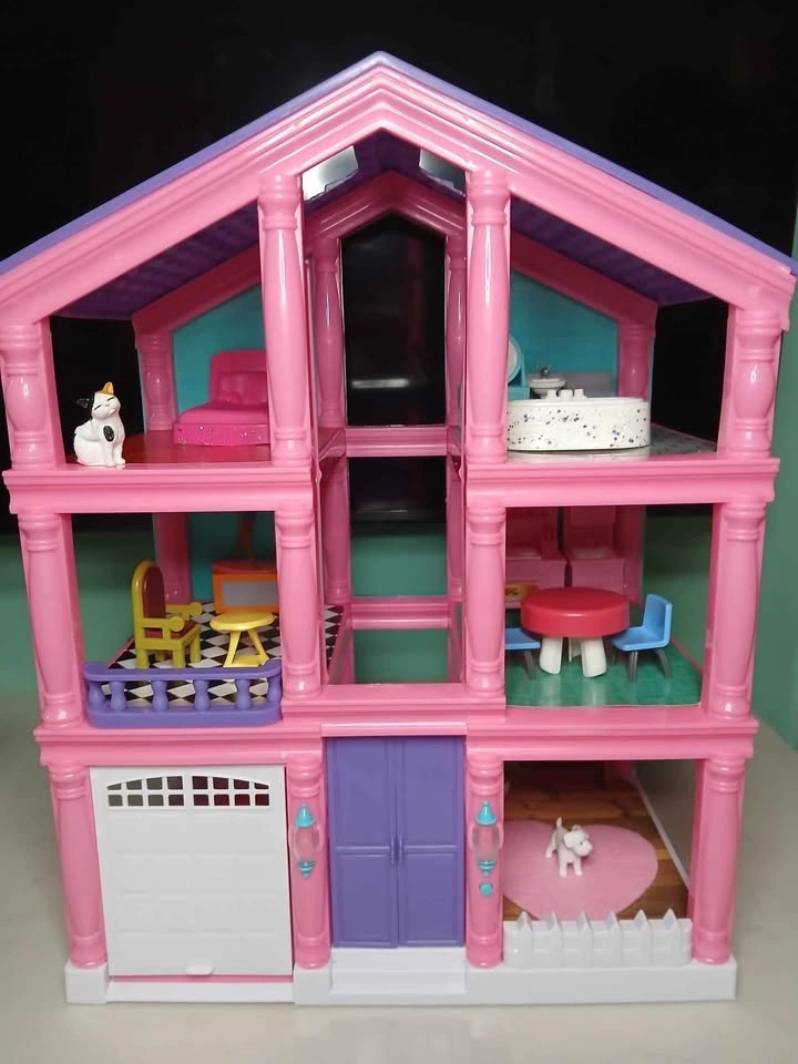 Cute pink dollhouse, 3 stories. Comes with furniture, a little cat, and dog. Features a red car in the garage. The kitchen has a table and two chairs, and the living room includes a couch. The bathroom has a toilet and sink.