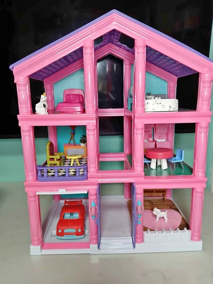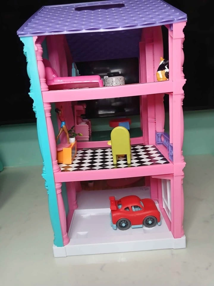Cute pink dollhouse, 3 stories. Comes with furniture, a little cat, and dog. Features a red car in the garage. The kitchen has a table and two chairs, and the living room includes a couch. The bathroom has a toilet and sink.