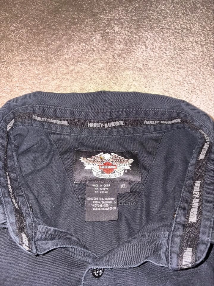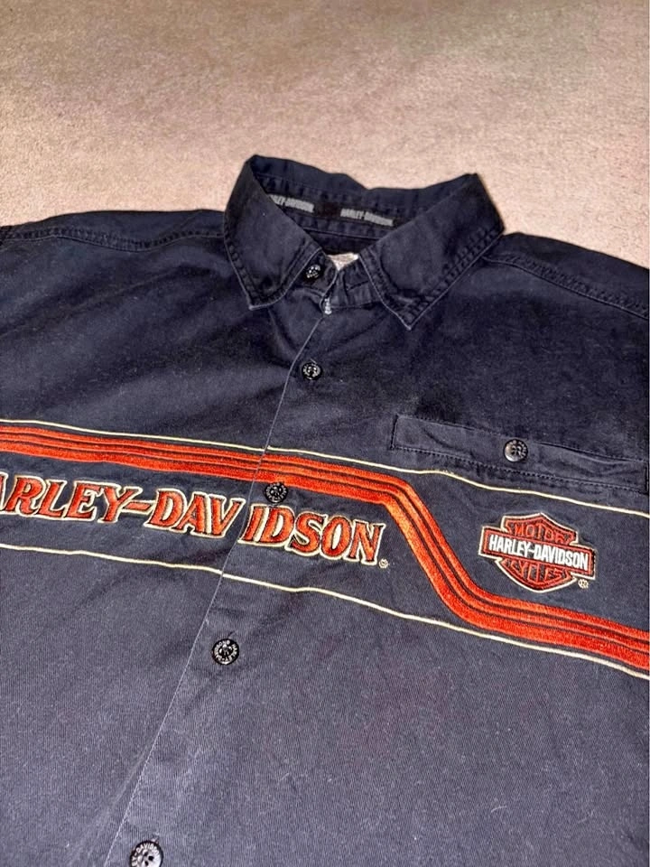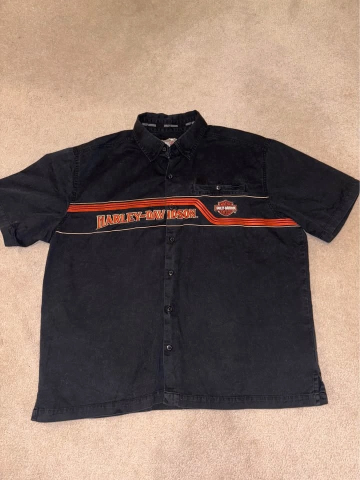 Black Harley-Davidson button-up shirt with orange and white accents. Features a logo on the front and back. Made of 100% cotton. Size XL. In good condition.