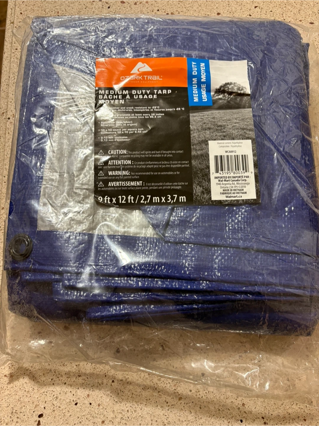 This Ozark Trail tarp is blue and measures 9 ft x 12 ft. It's medium duty and suitable for various uses. UV protection recommended for extended outdoor use. Made in Vietnam.
