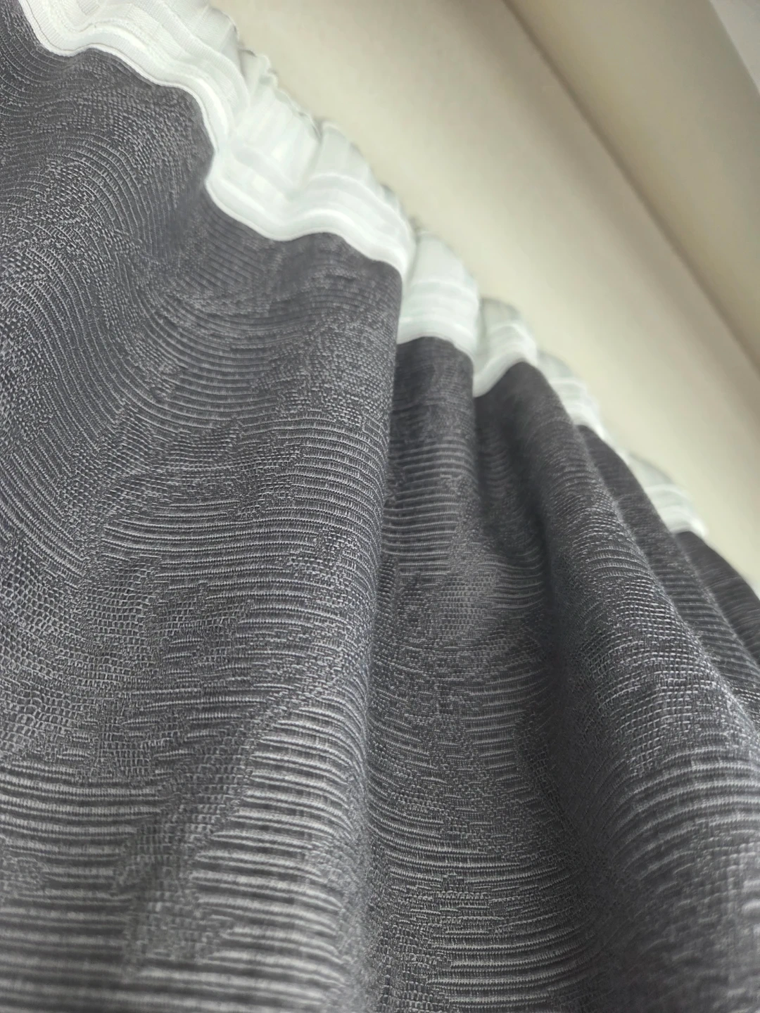 A pair of dark grey curtains featuring a subtle textured floral pattern. They come with a white ruffled header for hanging. These curtains are suitable for a bedroom or living room.