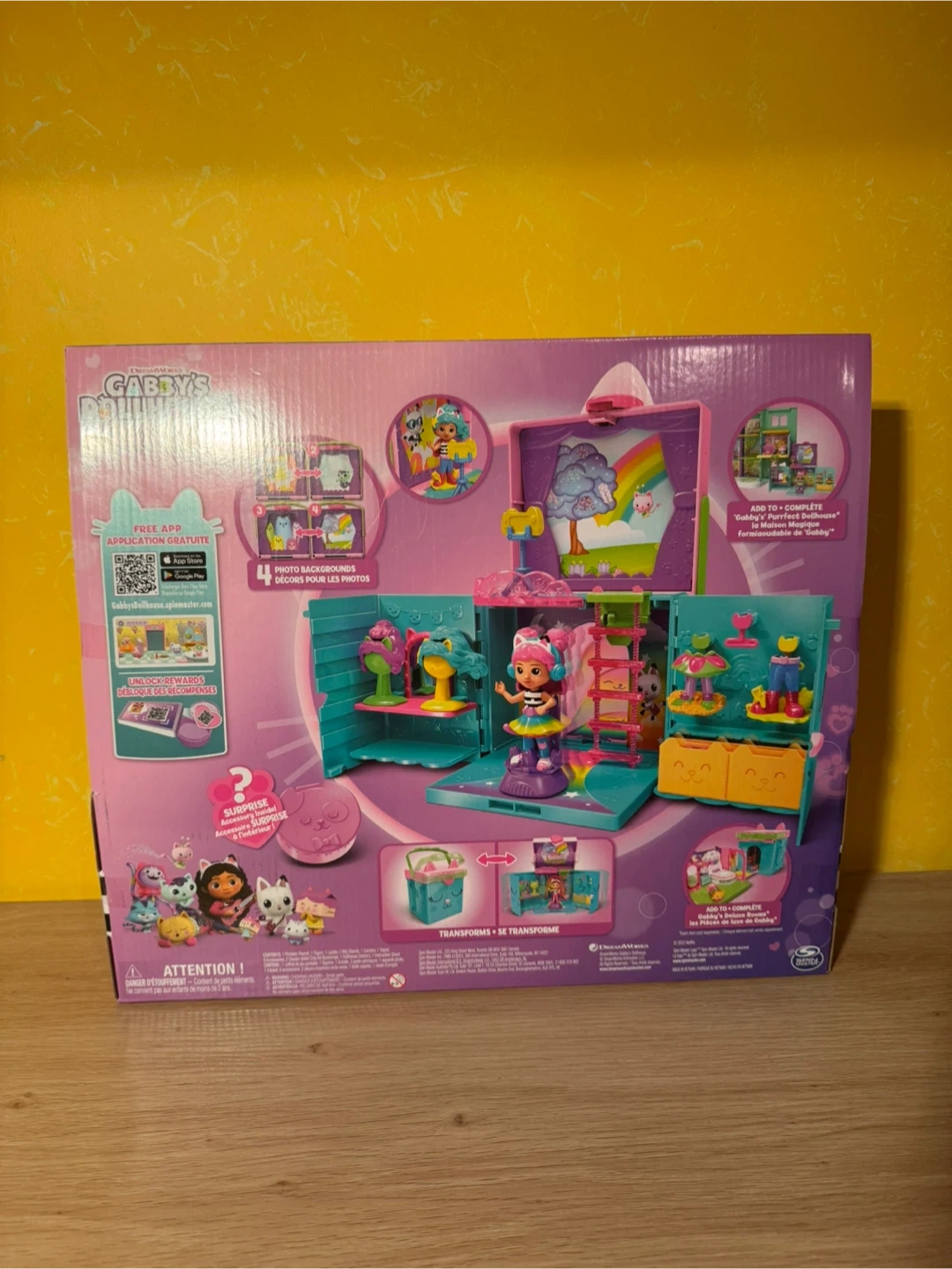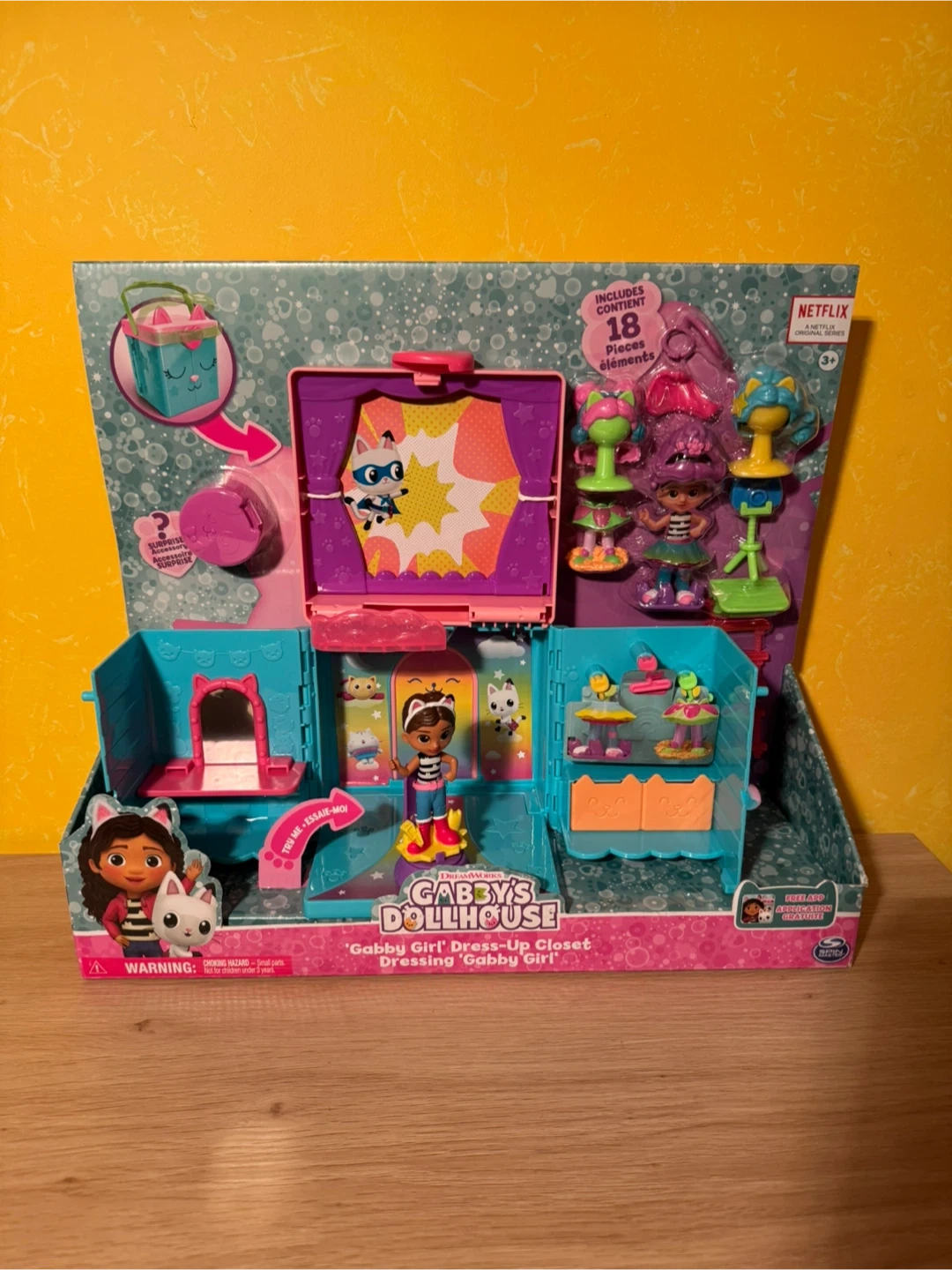 This Gabby's Dollhouse playset features Gabby Girl and includes 18 pieces for dress-up fun. The closet opens up to reveal different play areas and accessories. It's a surprise addition to any collection!