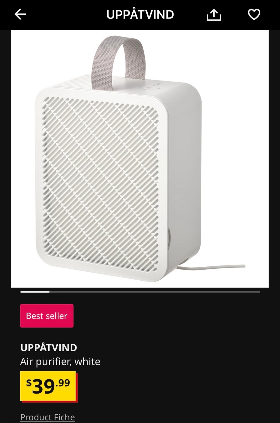 Selling an IKEA Uppatvind air purifier in white. It's in great shape and ready to help freshen up your space! It's lightweight and portable, so you can easily move it from room to room.