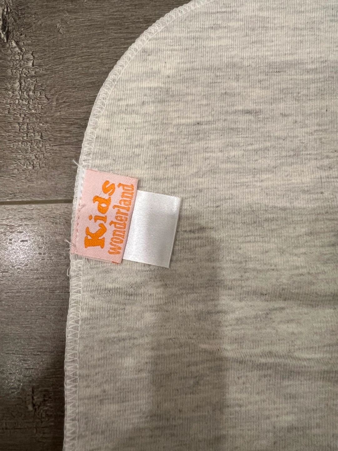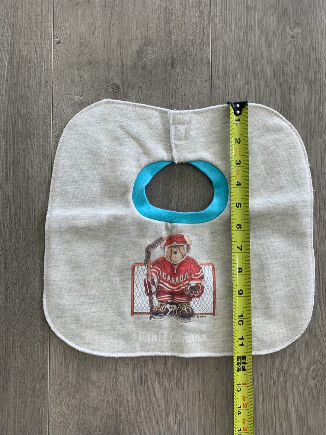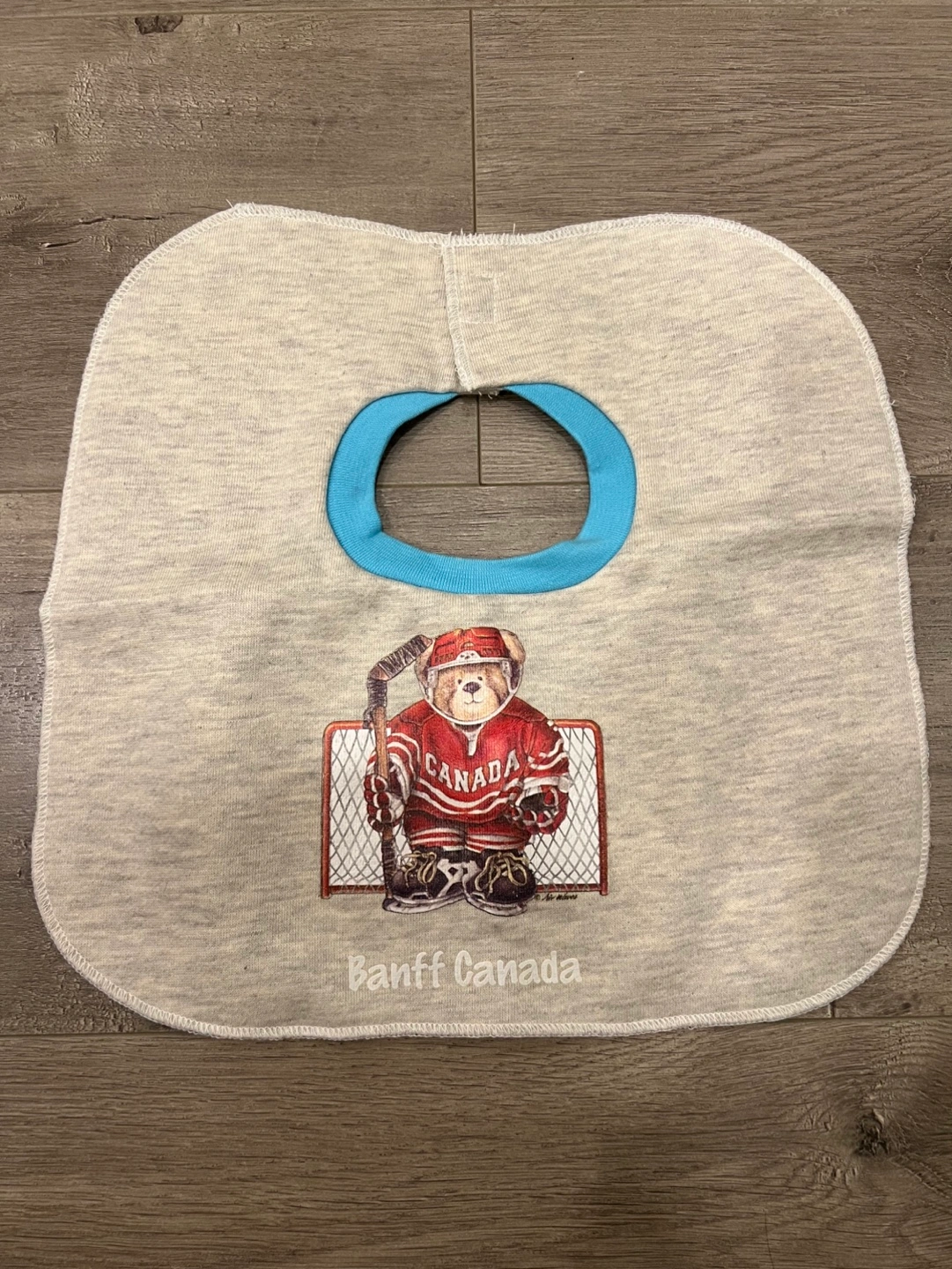 Adorable vintage baby bib. Features a graphic of a hockey-playing bear. Grey cotton material. Light blue trim. Banff Canada text.
