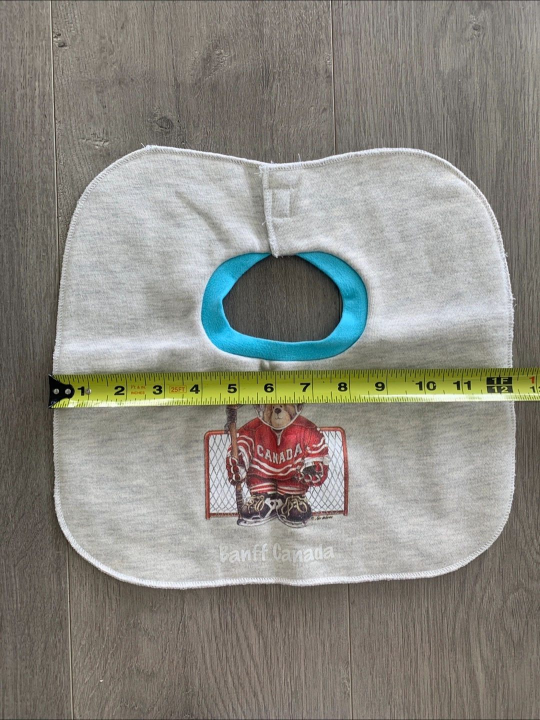 Adorable vintage baby bib. Features a graphic of a hockey-playing bear. Grey cotton material. Light blue trim. Banff Canada text.
